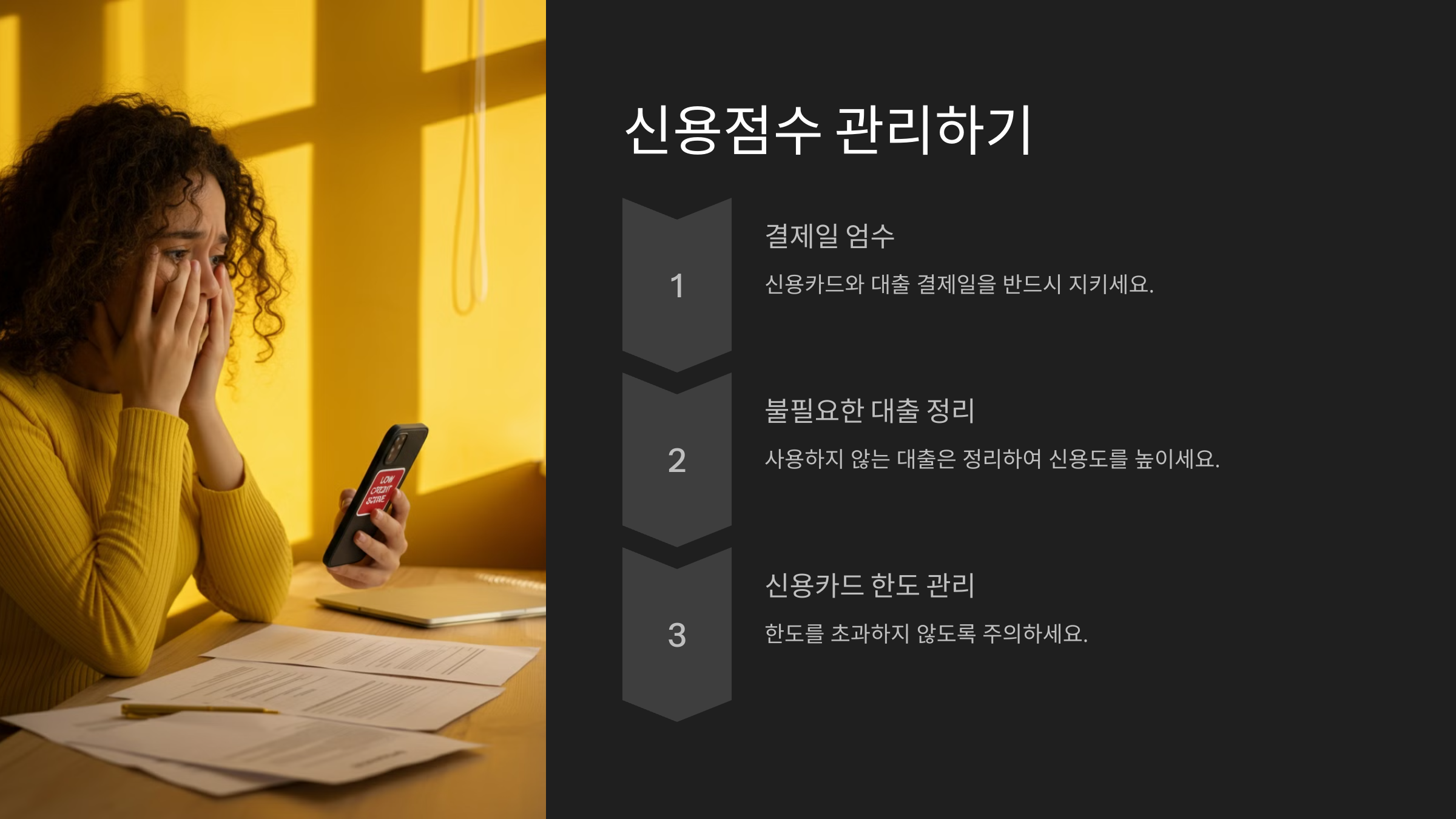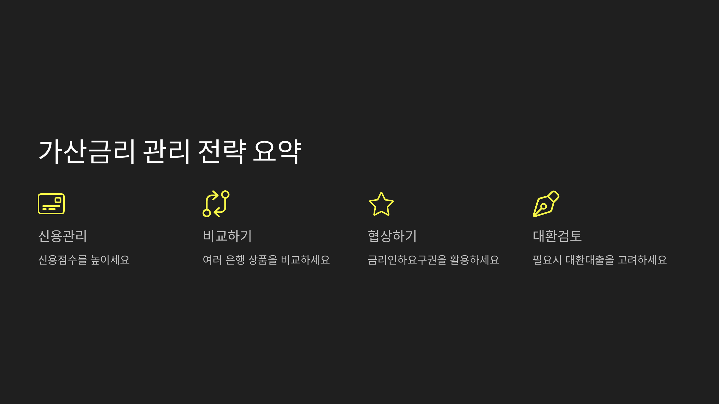 - 신용점수 관리하기: 신용점수를 높이면 가산금리를 낮출 가능성이 커집니다. 신용카드와 대출 결제일을 엄수하고, 불필요한 대출은 정리하며, 신용카드 한도를 초과하지 않도록 사용하세요.