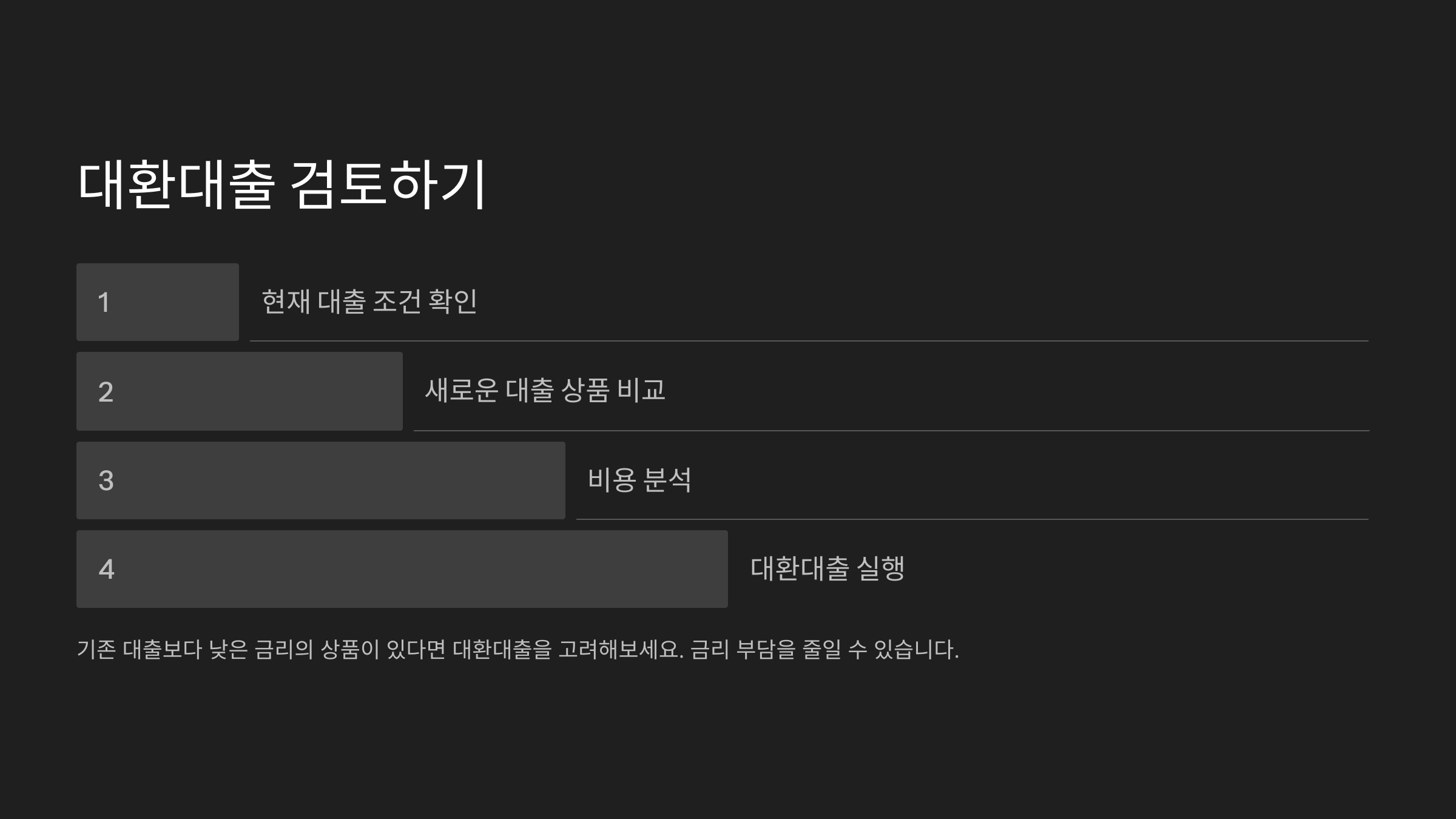 - 대환대출 검토하기: 기존 대출보다 더 낮은 금리를 제공하는 상품이 있다면 대환대출을 검토해 보세요. 대출 갈아타기를 통해 금리 부담을 줄일 수 있습니다.