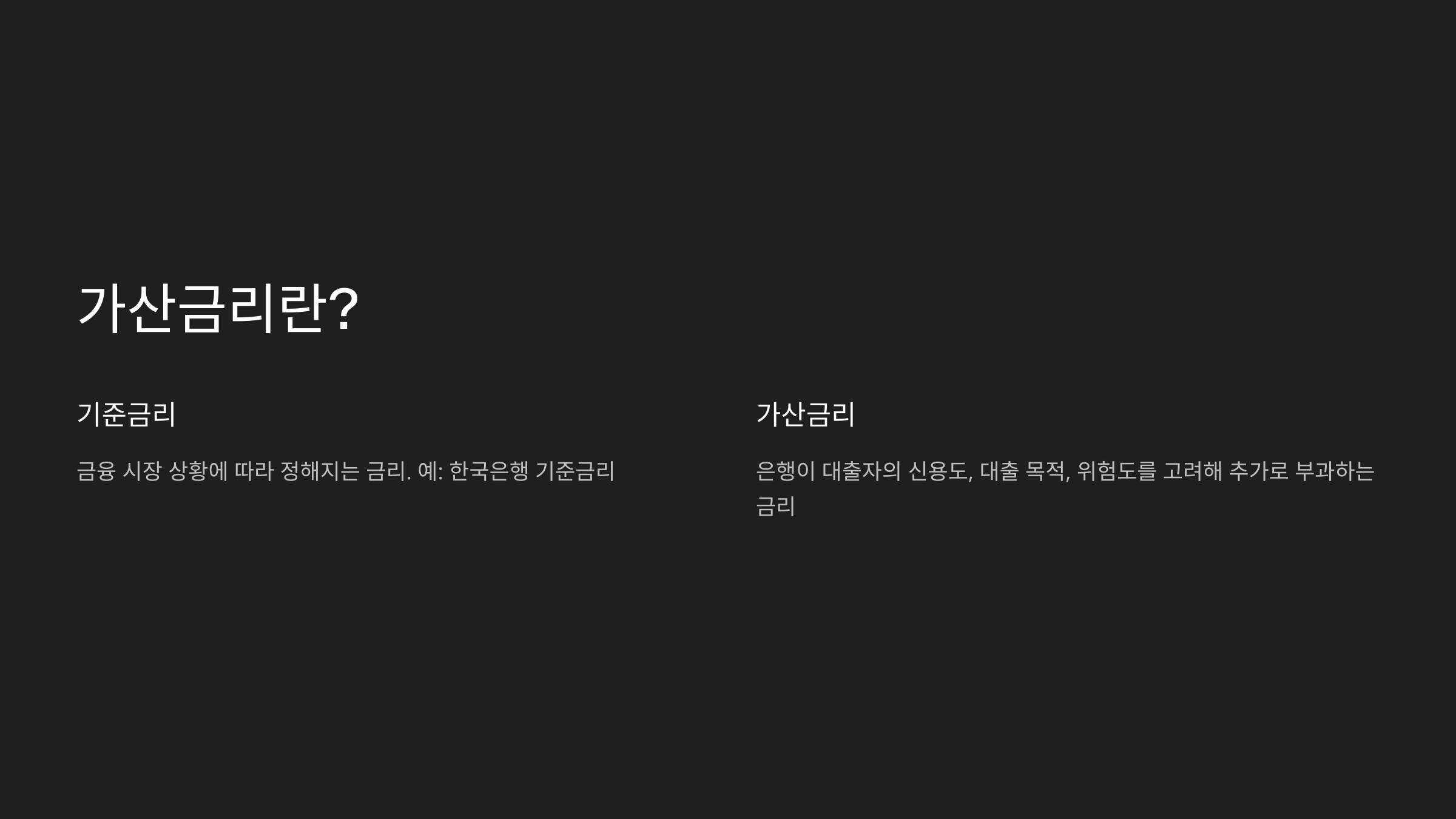 대출금리는 크게 두 가지로 나뉩니다: 기준금리와 가산금리입니다. 기준금리는 금융 시장 상황에 따라 정해지는 금리로, 예를 들어 한국은행의 기준금리가 이에 해당합니다. 반면, 가산금리는 은행이 대출자의 신용도, 대출 목적, 위험도를 고려해 추가로 부과하는 금리입니다. 쉽게 말해, 가산금리는 은행이 대출의 '위험비용'을 반영한 추가 금리입니다. 같은 기준금리를 적용받더라도, 가산금리에 따라 최종 대출금리가 크게 달라질 수 있습니다.