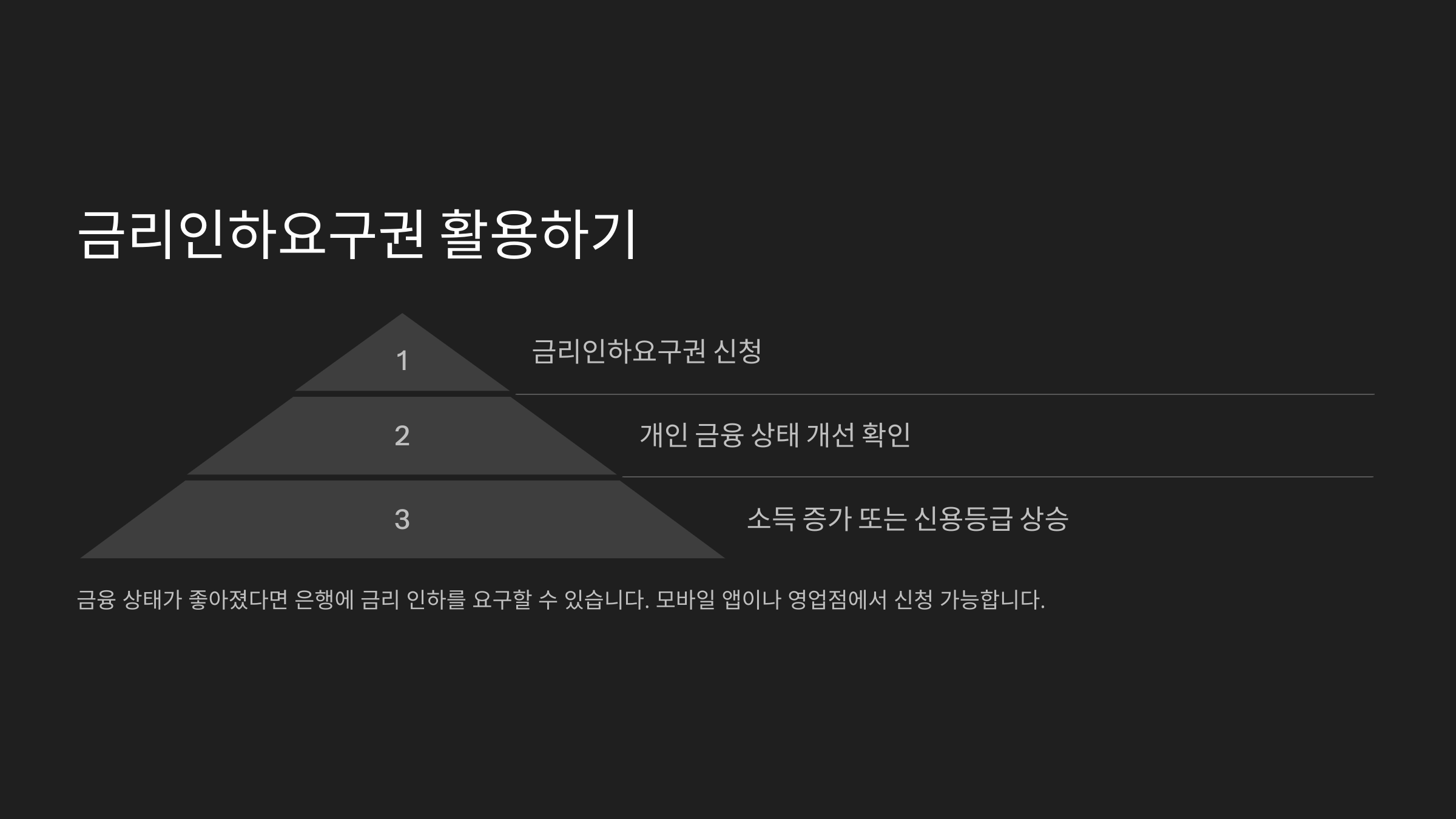 - 금리인하요구권 활용하기: 소득이 증가하거나 신용등급이 올라가는 등 개인의 금융 상태가 좋아졌다면 금리 인하를 요구할 수 있습니다. 은행의 모바일 앱이나 영업점을 통해 간단히 신청 가능합니다.