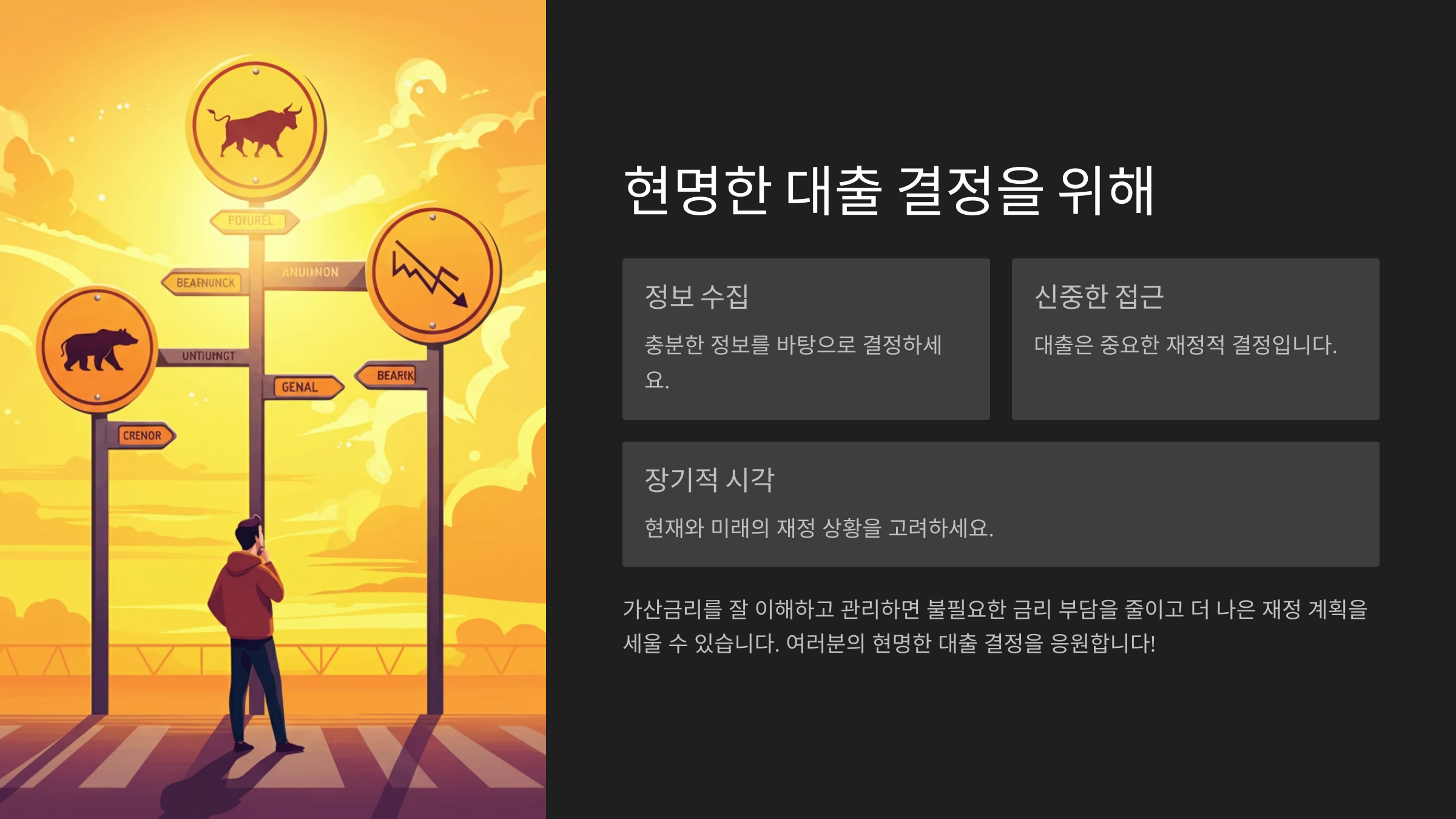 - 기준금리는 통제할 수 없지만, 가산금리는 개인의 노력으로 줄일 수 있습니다. 따라서 가산금리에 더 주목하세요.