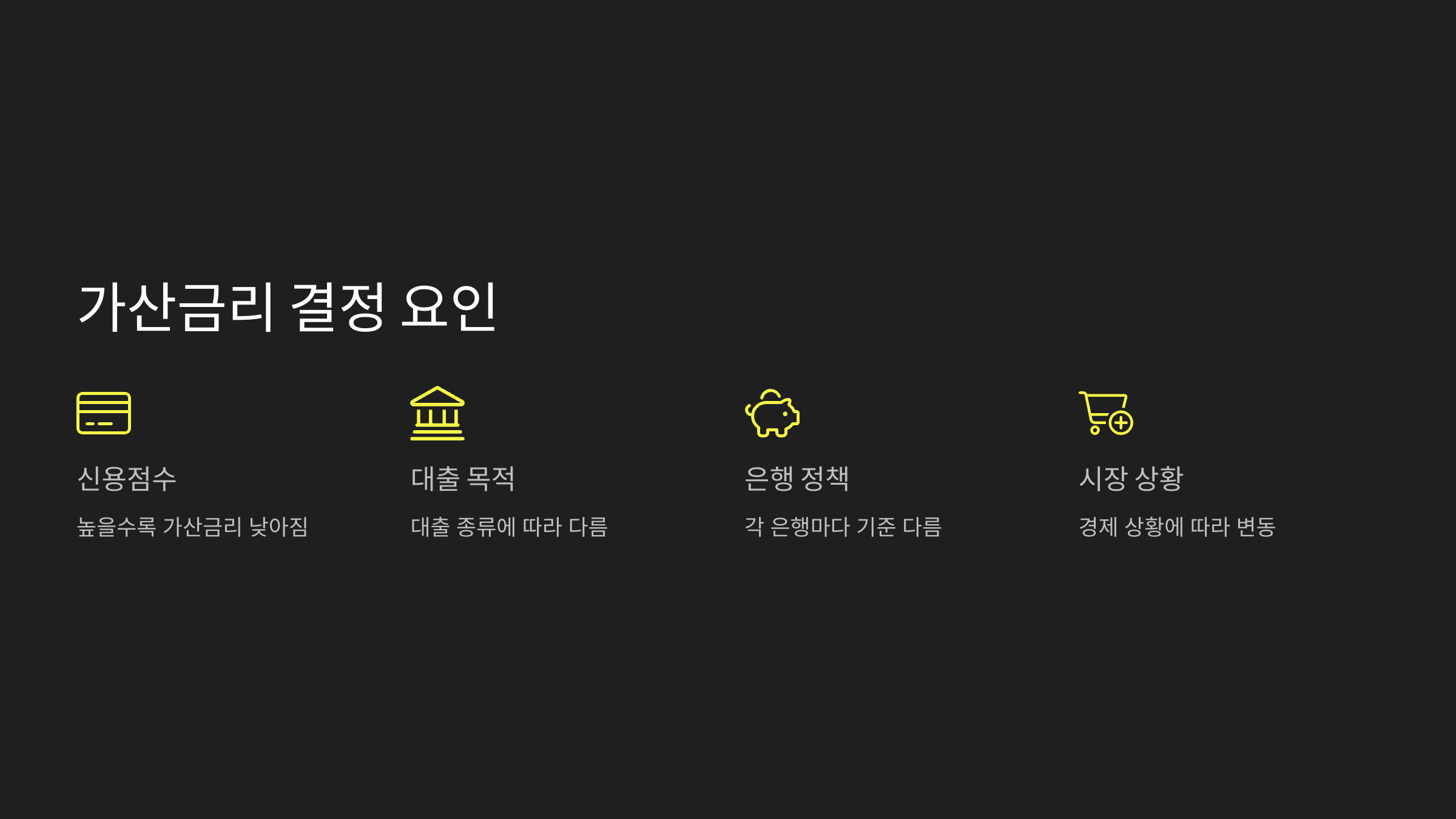 - 신용점수: 신용점수가 높을수록 은행은 대출자를 안전한 고객으로 보고 가산금리를 낮춥니다.