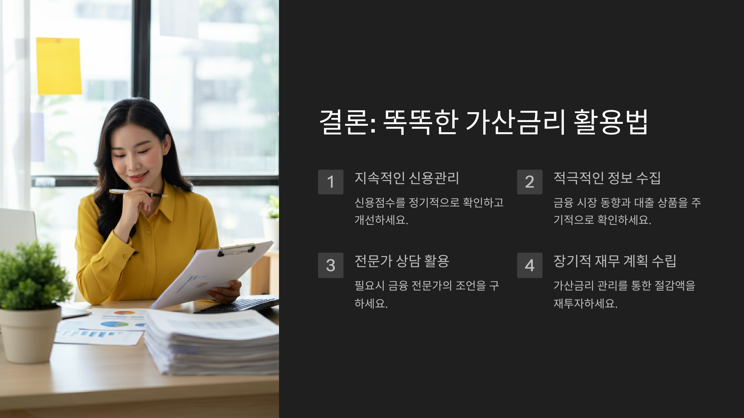 가산금리는 대출 금리에서 개인이 영향을 줄 수 있는 중요한 요소입니다. 신용점수를 잘 관리하고, 여러 은행 상품을 비교하며, 필요하면 금리인하요구권을 적극 활용하세요. 대출은 중요한 재정적 결정입니다. 충분한 정보를 바탕으로 신중히 접근하면 불필요한 금리 부담을 줄이고 더 나은 재정 계획을 세울 수 있습니다. 여러분의 현명한 대출 결정을 응원합니다!