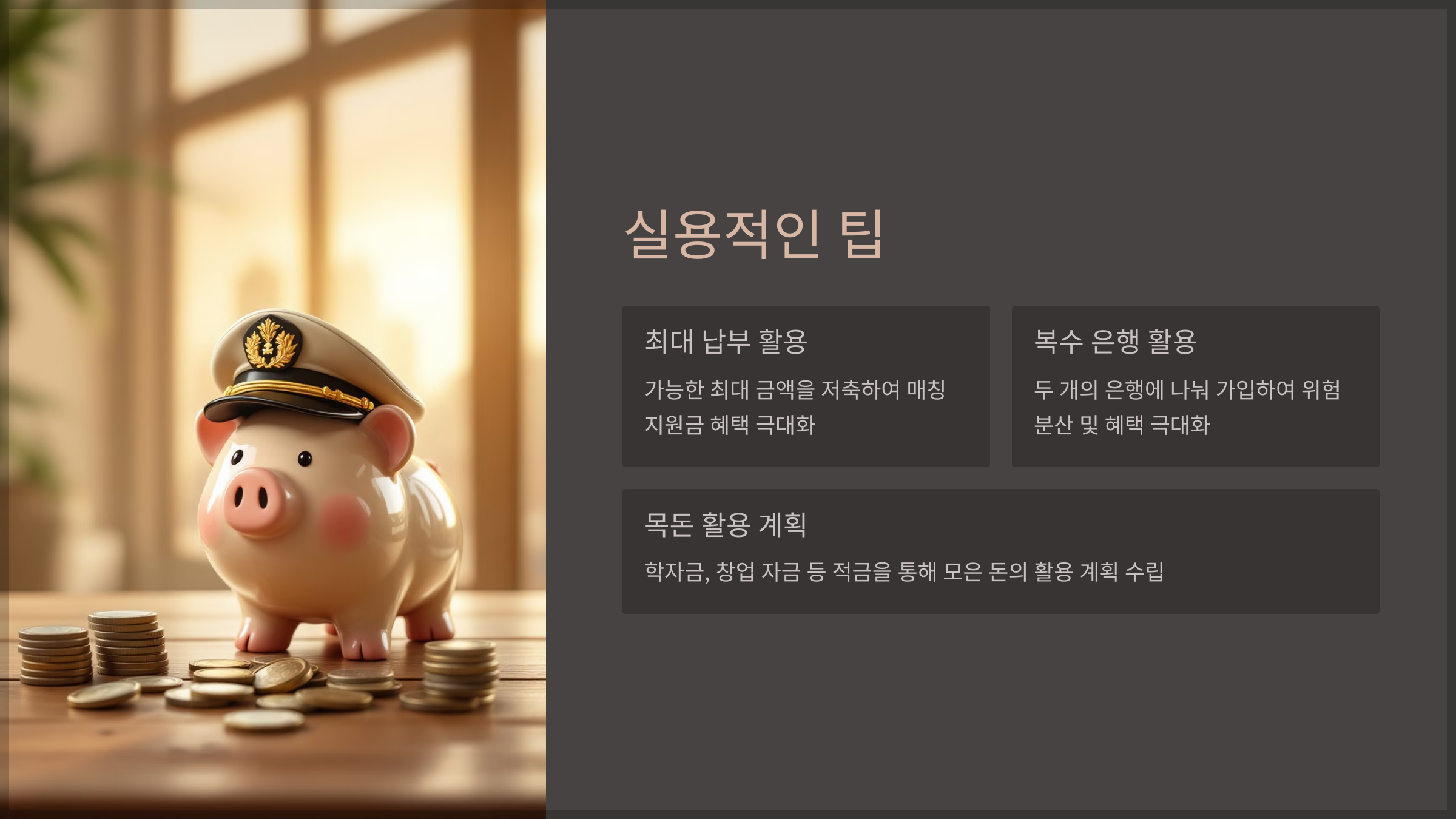 제가 복무하던 시절보다 혜택이 훨씬 좋아졌습니다. 군 복무 중 이렇게 큰 목돈을 모을 기회는 흔치 않으니 적극적으로 활용해 보세요.