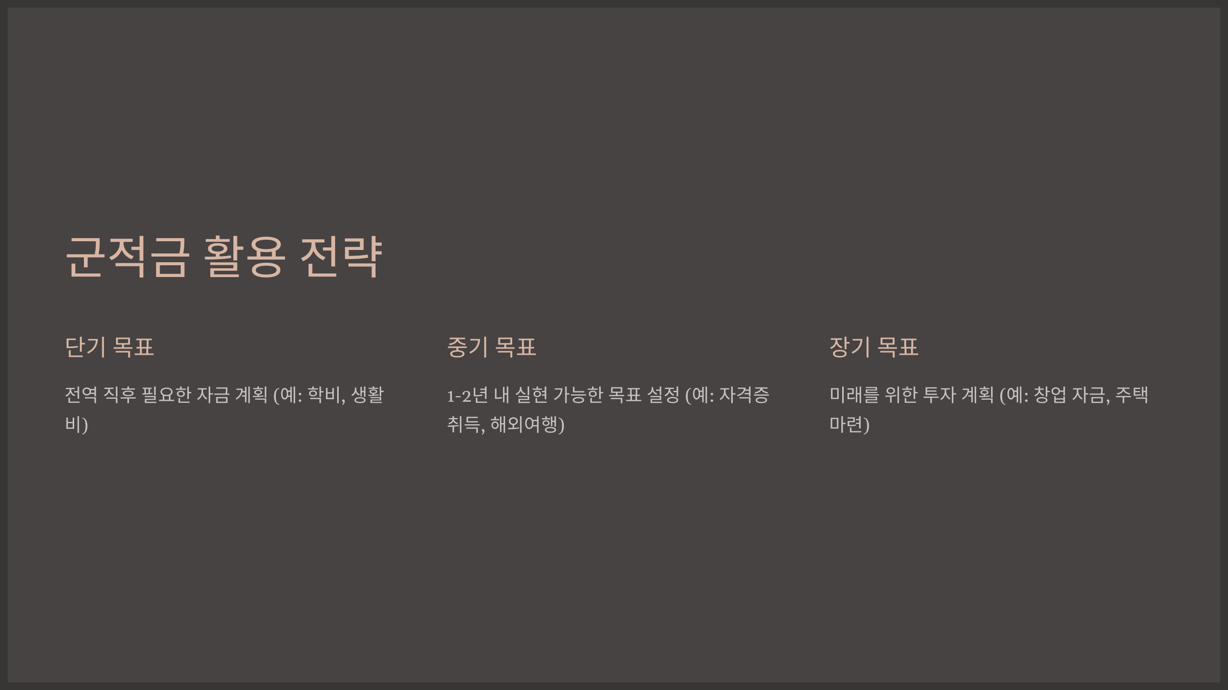 군적금은 단순한 저축이 아니라, 군 복무 기간 동안 미래를 준비할 좋은 기회입니다. 저도 군 적금을 통해 전역 후 안정적으로 재정 계획을 시작할 수 있었습니다. 이제는 여러분 차례입니다. 각 은행의 조건을 꼼꼼히 비교하고, 꾸준히 내며 목돈 마련의 기회를 잡으세요. 군 복무가 힘들게 느껴질 때, 적금을 통해 목표를 세우고 준비해 보세요. 전역 후 여러분의 노력이 값진 결과로 돌아올 것입니다.