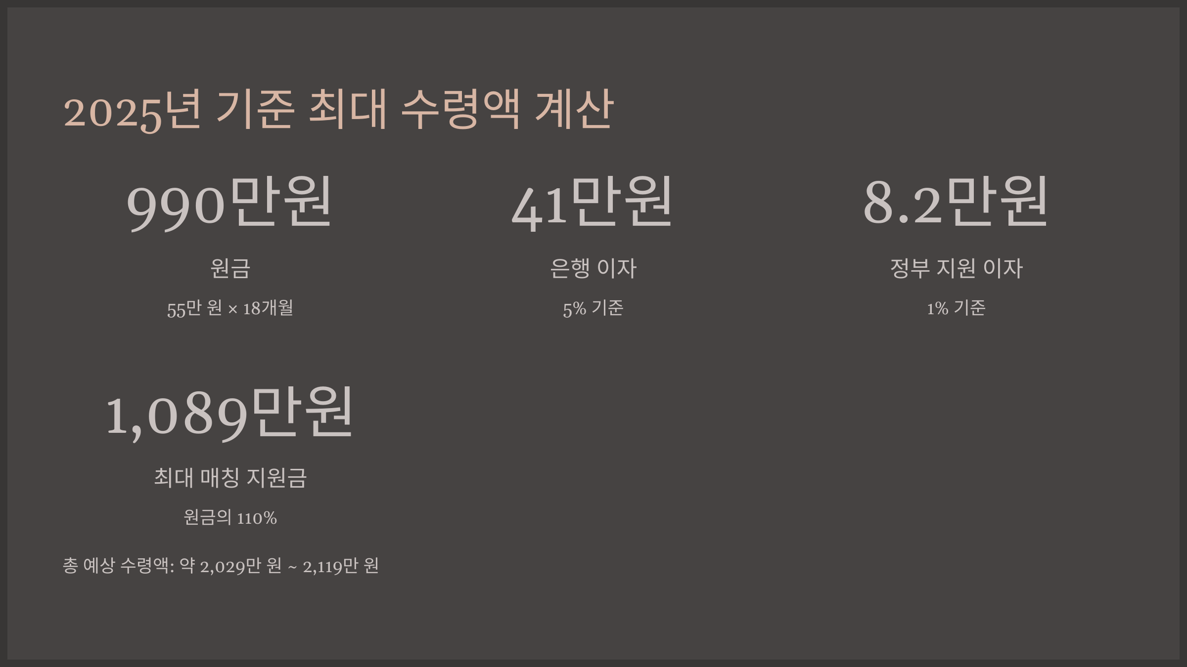 • 매칭 지원금: 원금의 100~110% = 최대 1,089만 원
