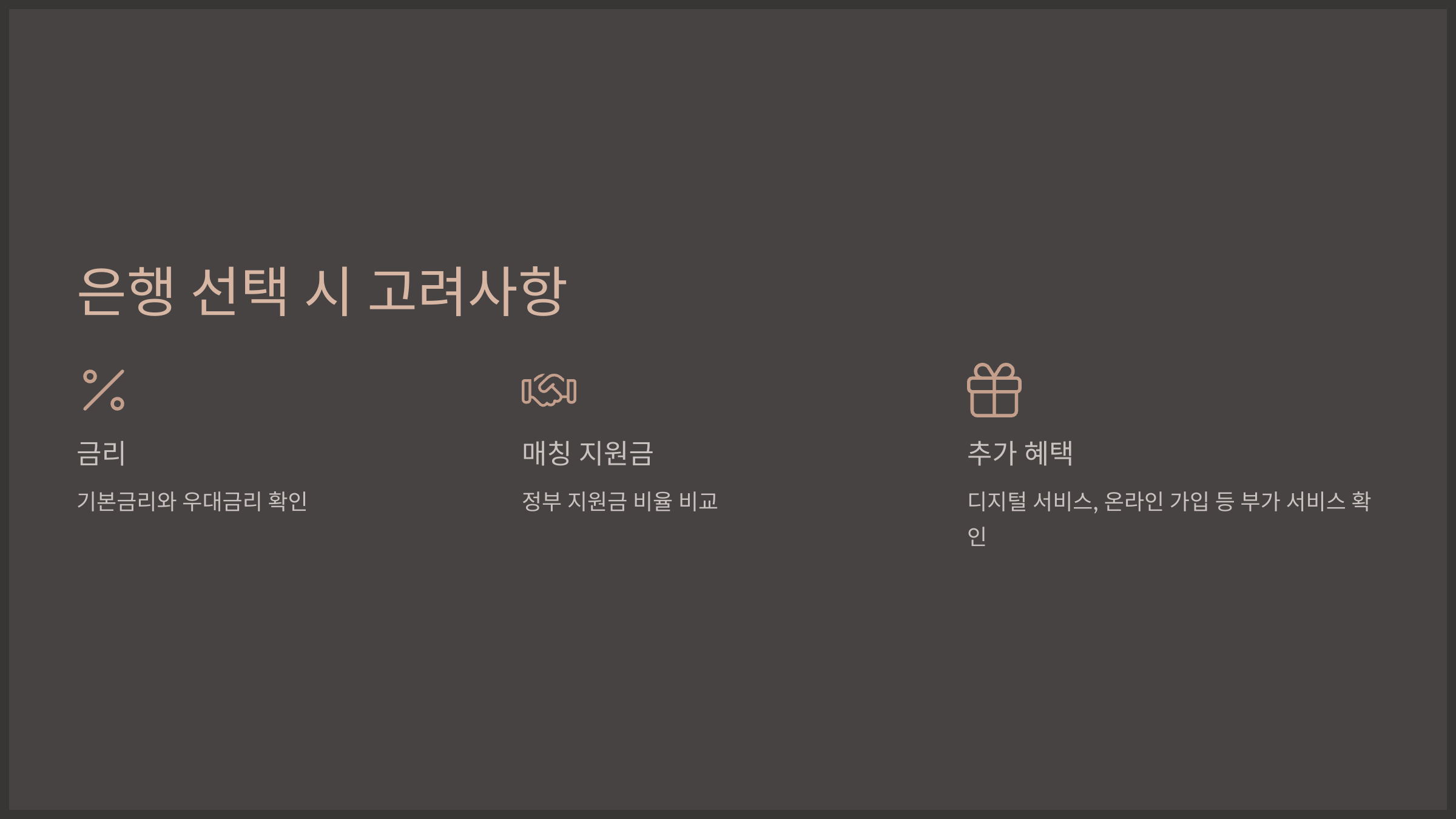 신한은행과 우리은행은 매칭 지원금 비율이 110%로 높아 상대적으로 더 많은 혜택을 제공합니다. 저는 가입 당시 여러 은행의 조건을 꼼꼼히 비교한 후 금리와 부가 혜택을 기준으로 선택했습니다. 여러분도 자신에게 맞는 은행을 선택해 보세요.