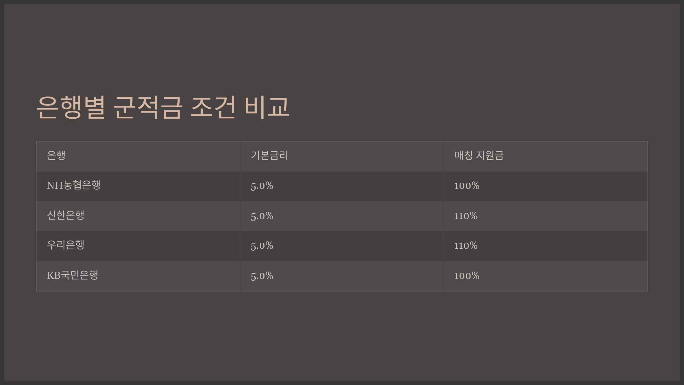 군적금 가입 시 가장 중요한 것은 은행 선택입니다. 각 은행의 금리와 매칭 지원금, 추가 혜택 등을 비교해 가장 유리한 조건을 선택해야 합니다. 2025년 기준 주요 은행별 조건은 다음과 같습니다.
