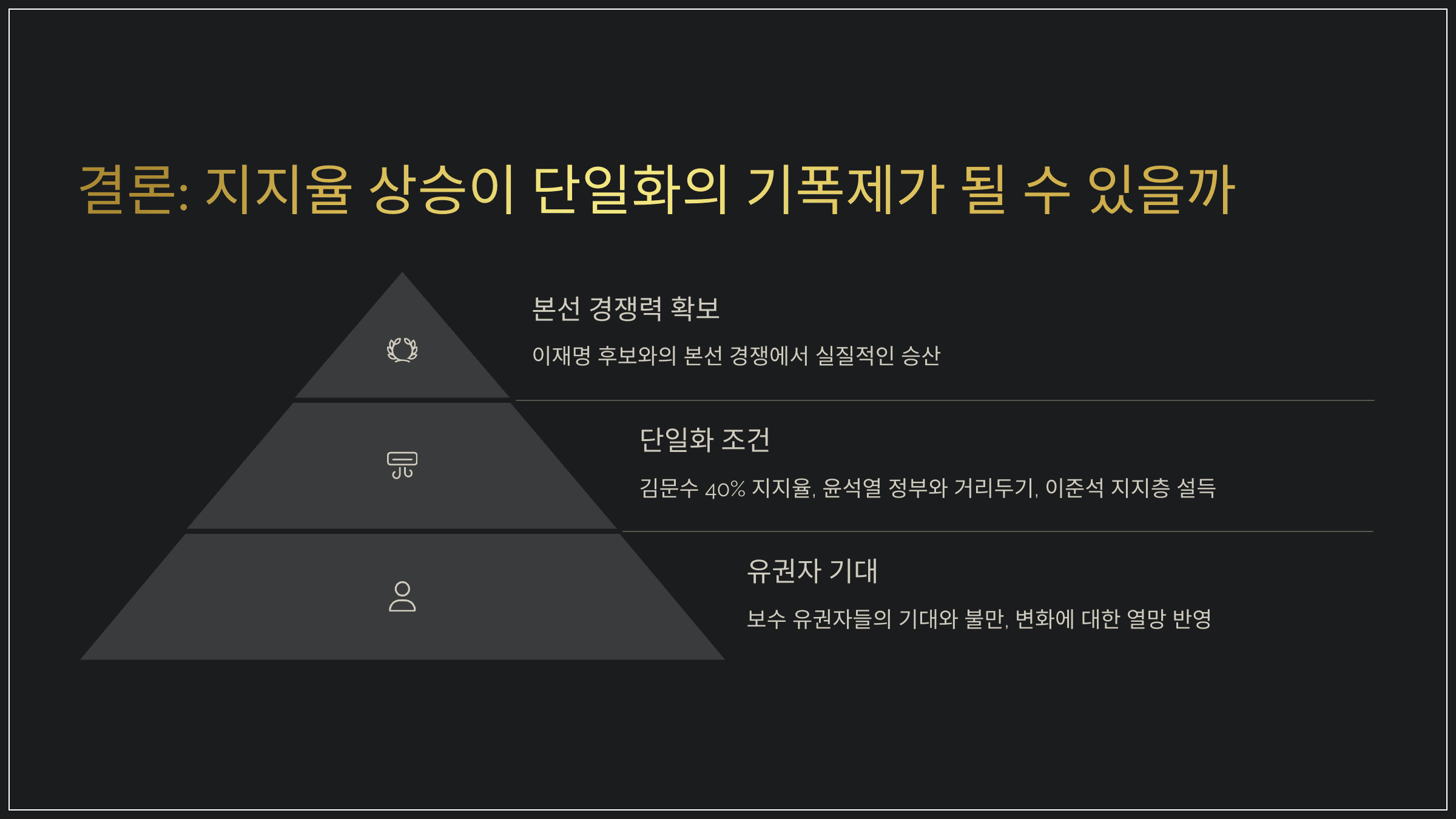 특히 김문수가 40% 이상의 지지율을 기록하게 될 경우, 단일화는 선택이 아닌 필수 전략으로 떠오를 가능성이 높다.