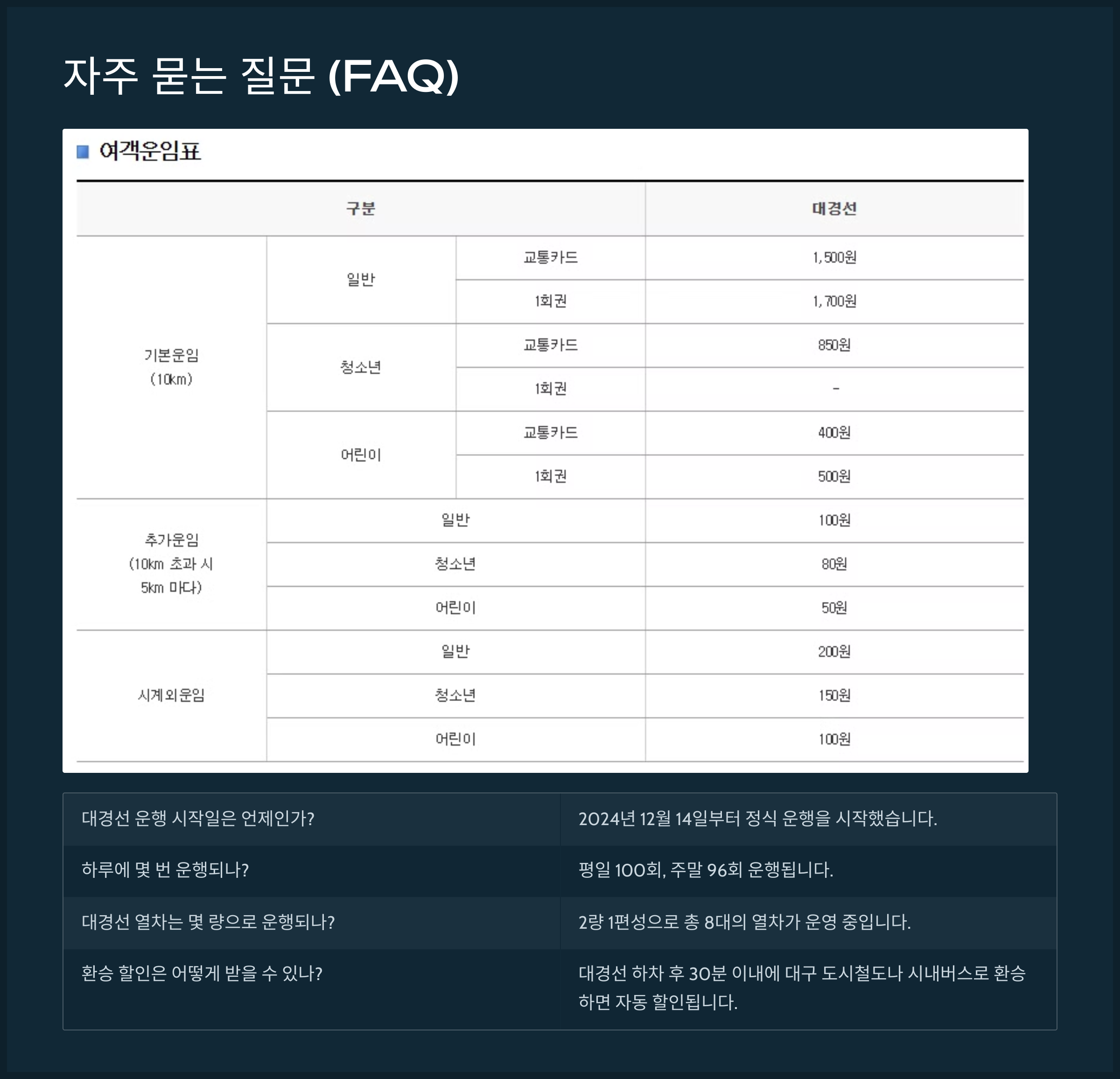 ✅ A5: 대경선 공식 홈페이지나 모바일 앱에서 출발역과 도착역을 입력하면 정확한 요금을 확인할 수 있다.