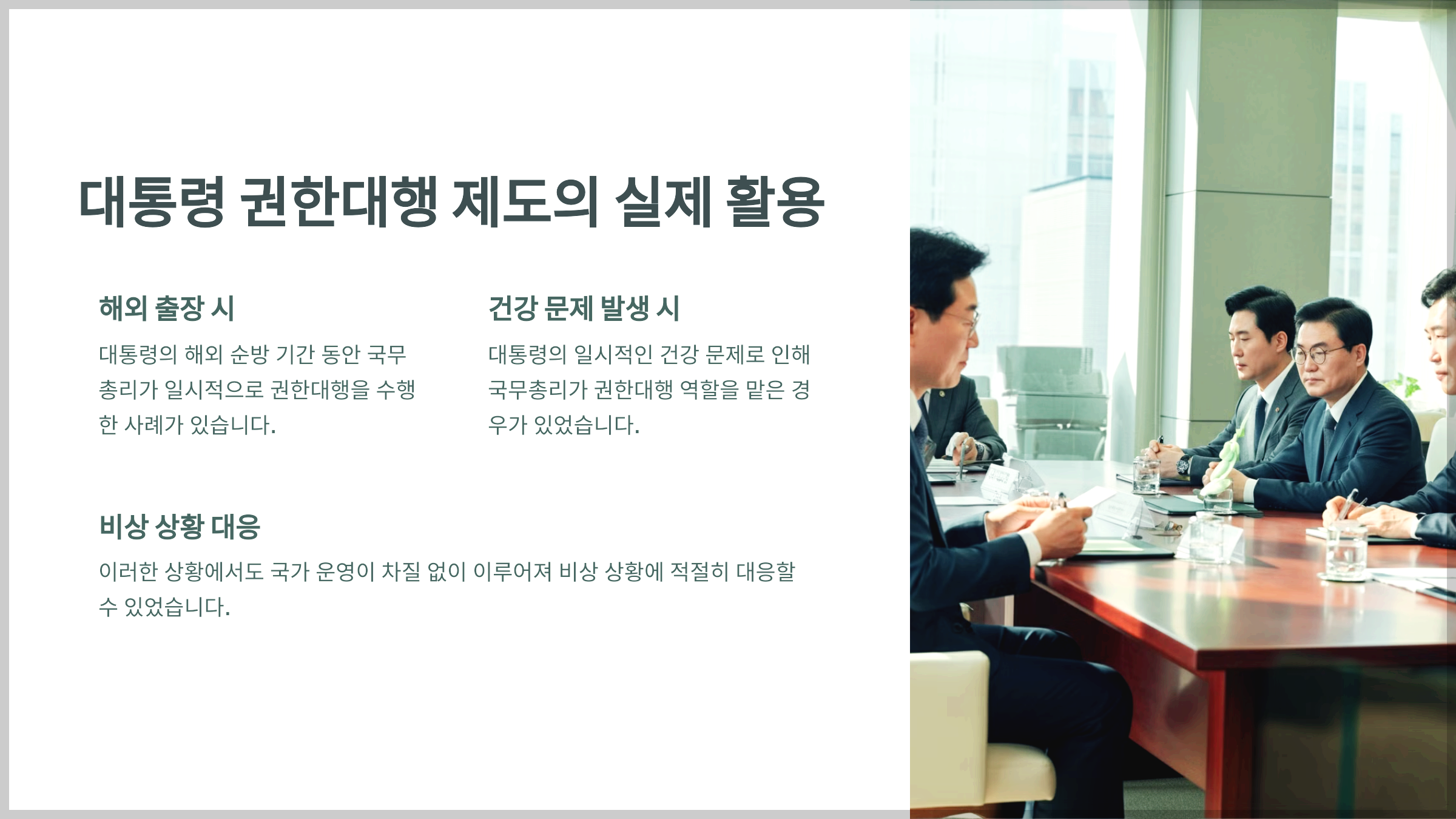 이 제도는 대한민국 역사에서 여러 차례 발동된 바 있습니다. 예를 들어, 대통령의 해외 출장이나 일시적인 건강 문제로 인해 국무총리가 권한대행 역할을 수행한 사례가 있습니다. 이러한 상황에서도 비상 상황에 맞춰 국가 운영이 차질 없이 이루어졌습니다.