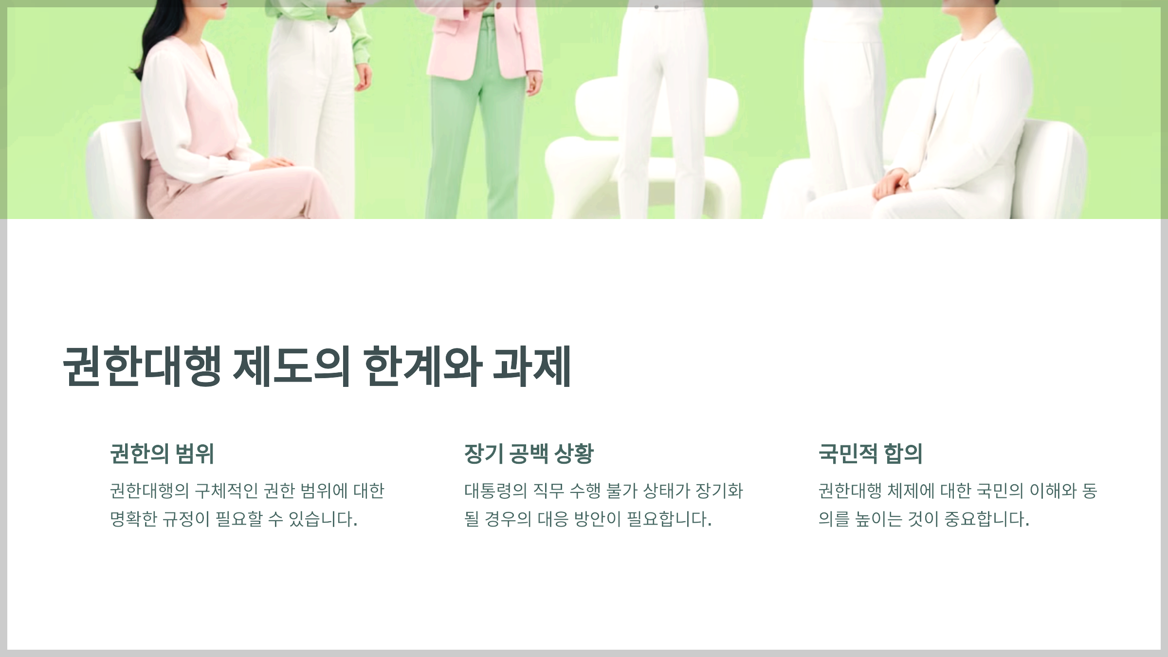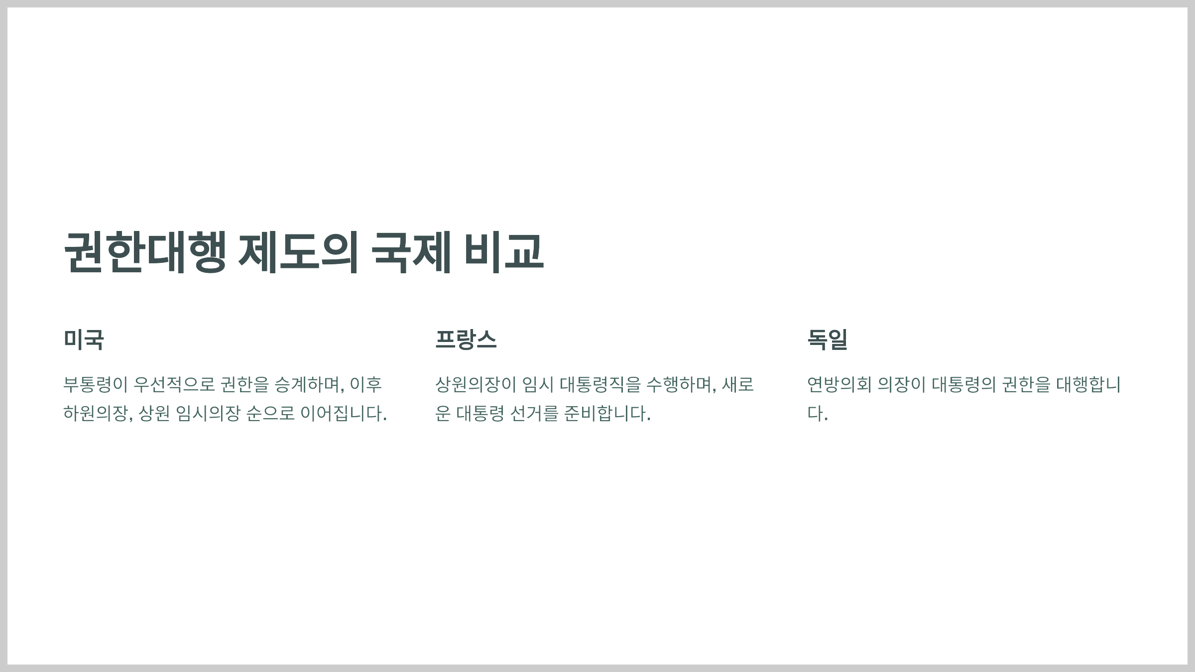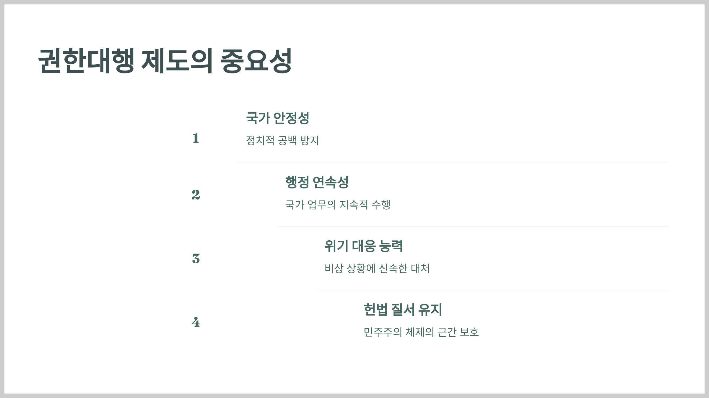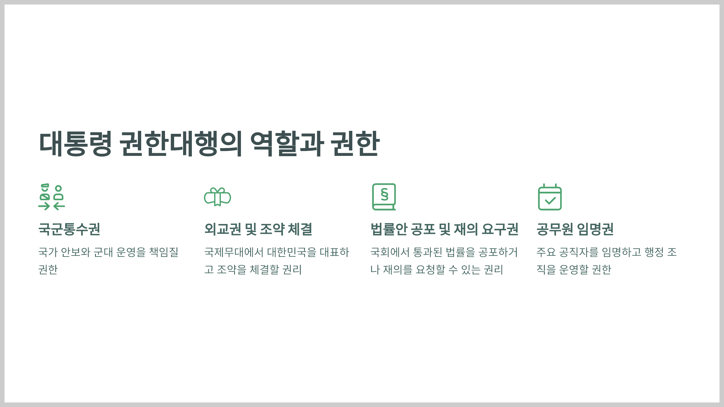 • 다만, 권한대행 체제에서는 중요한 정책 변경이나 대규모 인사 결정은 자제하며, 안정적인 국가 운영에 중점을 둡니다.