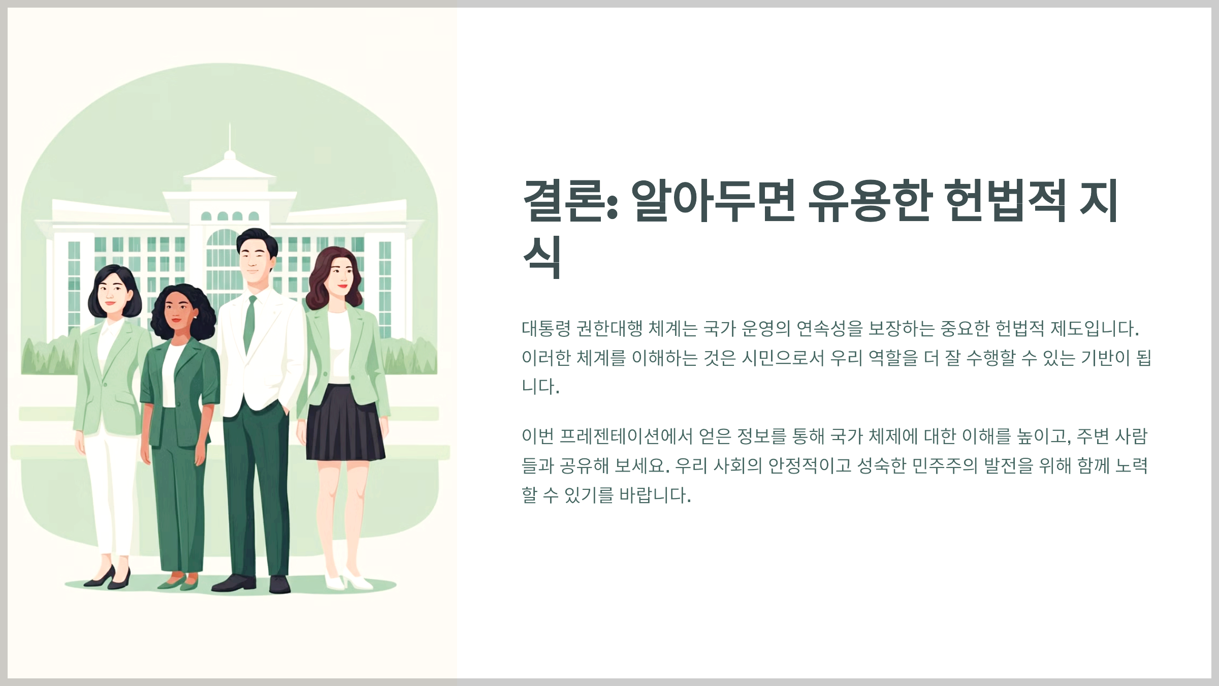 대통령 권한대행 체계는 국가 운영의 연속성을 보장하는 중요한 헌법적 제도입니다. 이러한 체계를 이해하는 것은 시민으로서 우리 역할을 더 잘 수행할 수 있는 기반이 됩니다. 이번 글에서 얻은 정보를 통해 국가 체제에 대한 이해를 높이고, 주변 사람들과 공유해 보세요. 우리 사회의 안정적이고 성숙한 민주주의 발전을 위해 함께 노력할 수 있기를 바랍니다.