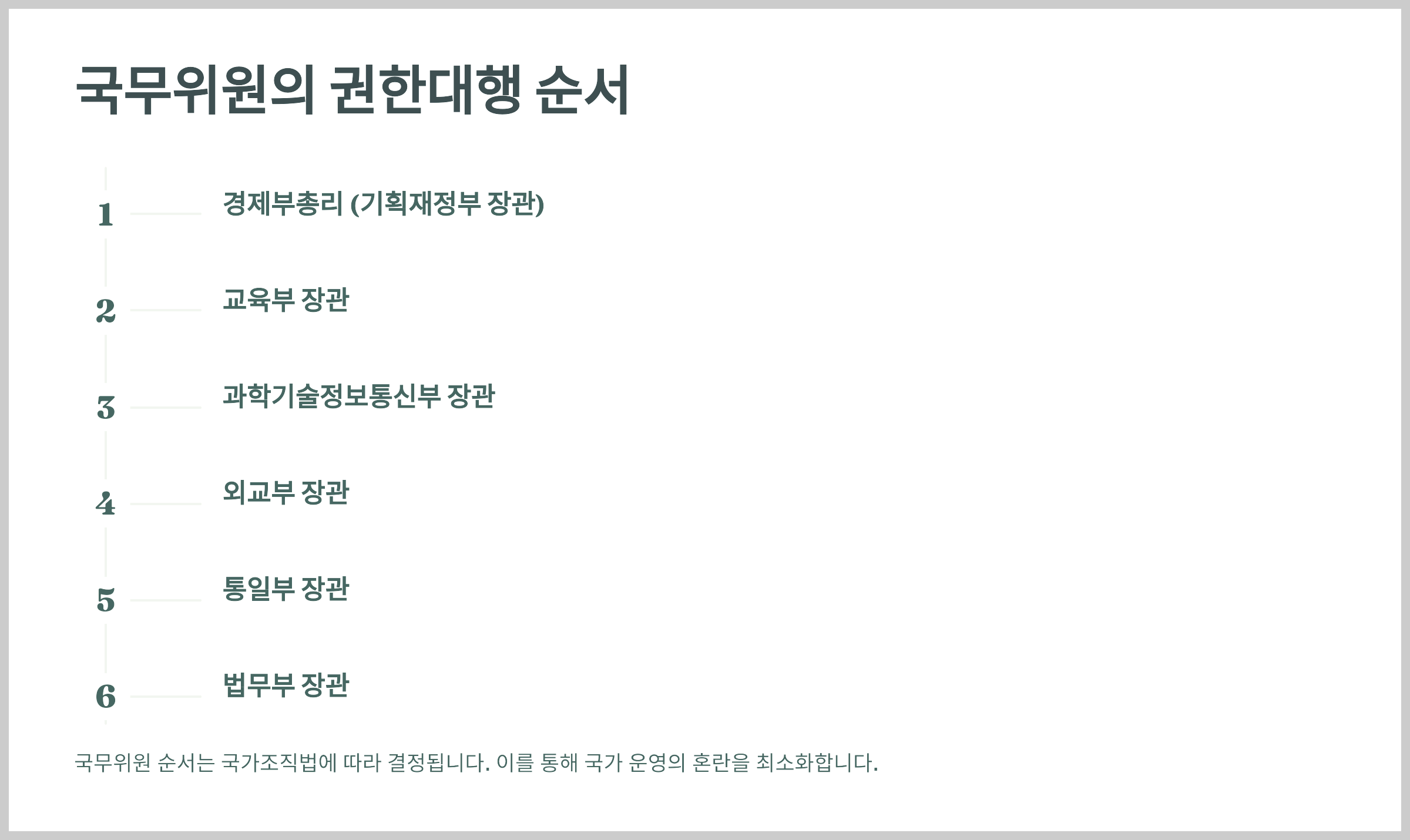 국무총리가 가장 먼저 권한대행을 수행합니다. 만약 국무총리가 직무를 수행할 수 없는 경우, 법률이 정한 국무위원이 순서에 따라 권한대행 역할을 맡게 됩니다. 이 체계는 국가 운영의 안정성과 연속성을 보장하기 위해 설계된 헌법적 장치입니다.