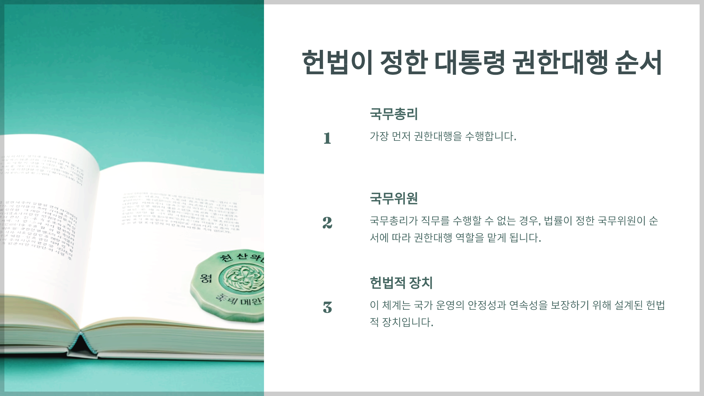 이와 같은 상황에서 국가의 안정적인 운영을 위해 대통령 권한대행 제도가 발동됩니다.