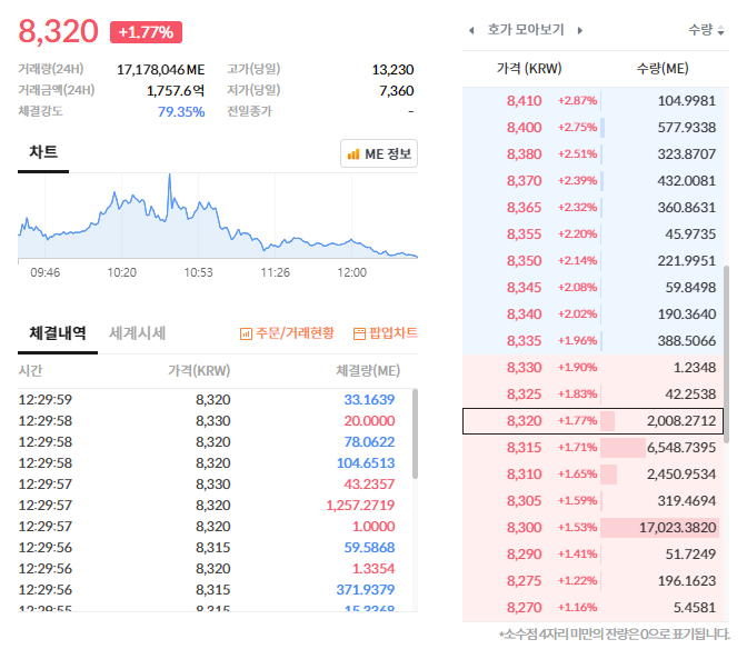 ME 코인은 2024년 12월 10일 오후 11시부터 업비트에서 입출금이 시작되었습니다. 11월 초 미국 대선에서 암호화폐 폐인 폴 앳킨스가 지명되었다는 소식이 호재로 작용하여 2024년 12월 5일 10만 달러를 돌파하였습니다.