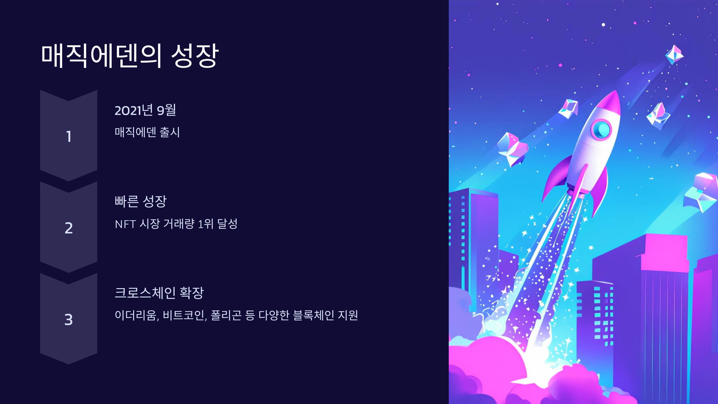 매직에덴은 2021년 9월 출시 이후 빠르게 성장하여 현재 NFT 시장에서 거래량 1위를 기록하고 있습니다. 처음에는 솔라나 기반으로 시작했지만, 현재는 이더리움, 비트코인, 폴리곤 등 여러 블록체인을 지원하는 크로스체인 플랫폼으로 발전했습니다. 개인적으로도 이 플랫폼을 사용해 본 경험이 있는데, 사용성이 매우 뛰어났습니다.