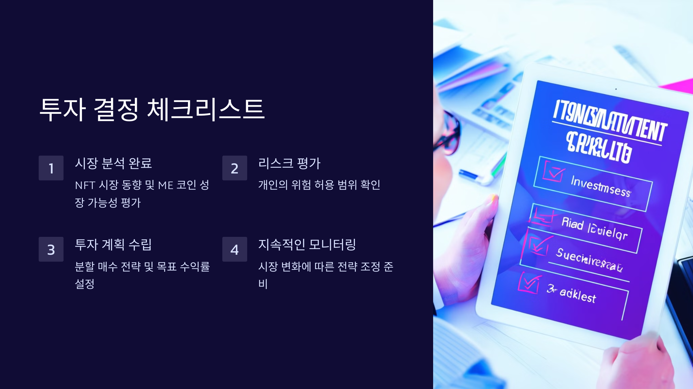 • 장기적 관점 유지: NFT 시장과 블록체인 기술의 발전을 고려할 때, ME 코인은 중장기적으로 매력적인 투자 자산이 될 가능성이 있습니다.