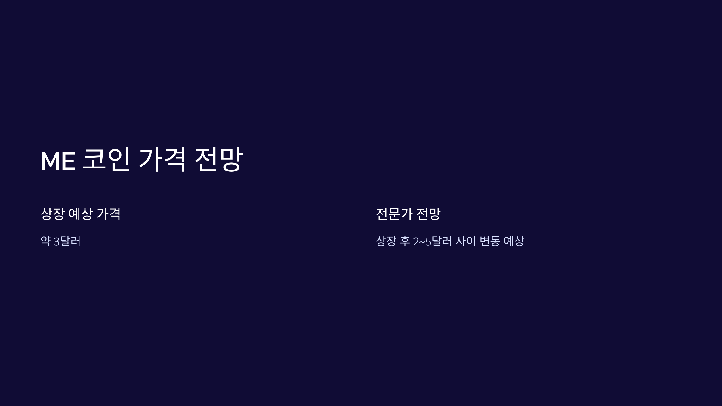 ME 코인의 상장 가격은 약 3달러로 예상되며, 전문가들은 상장 후 2~5달러 사이의 변동성을 전망하고 있습니다. 신규 상장 코인은 초기 가격 변동성이 크기 때문에, 계획적인 접근이 필수적입니다.