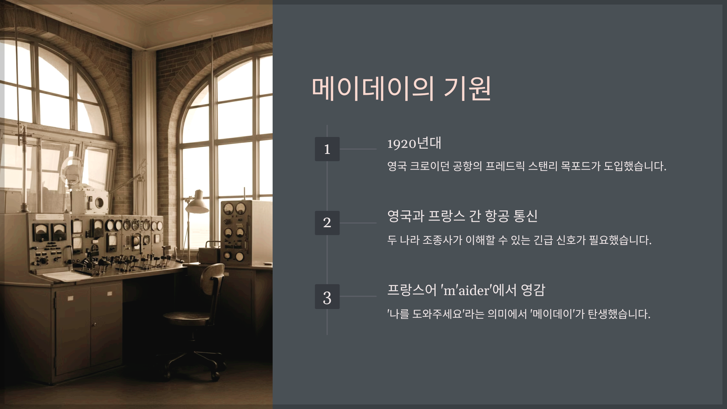 이 구조 신호는 1920년대에 영국 크로이던 공항의 수석 무선 통신사였던 프레드릭 스탠리 목포드에 의해 처음 도입되었습니다. 당시 영국과 프랑스 간의 항공 통신이 빈번해지면서, 두 나라의 조종사 모두가 이해할 수 있는 긴급 신호의 필요성을 느꼈습니다. 프랑스어 'm'aider'(나를 도와주세요)에서 영감을 받아 '메이데이'라는 용어가 탄생하였고, 이는 국제 표준으로 빠르게 자리 잡았습니다.
