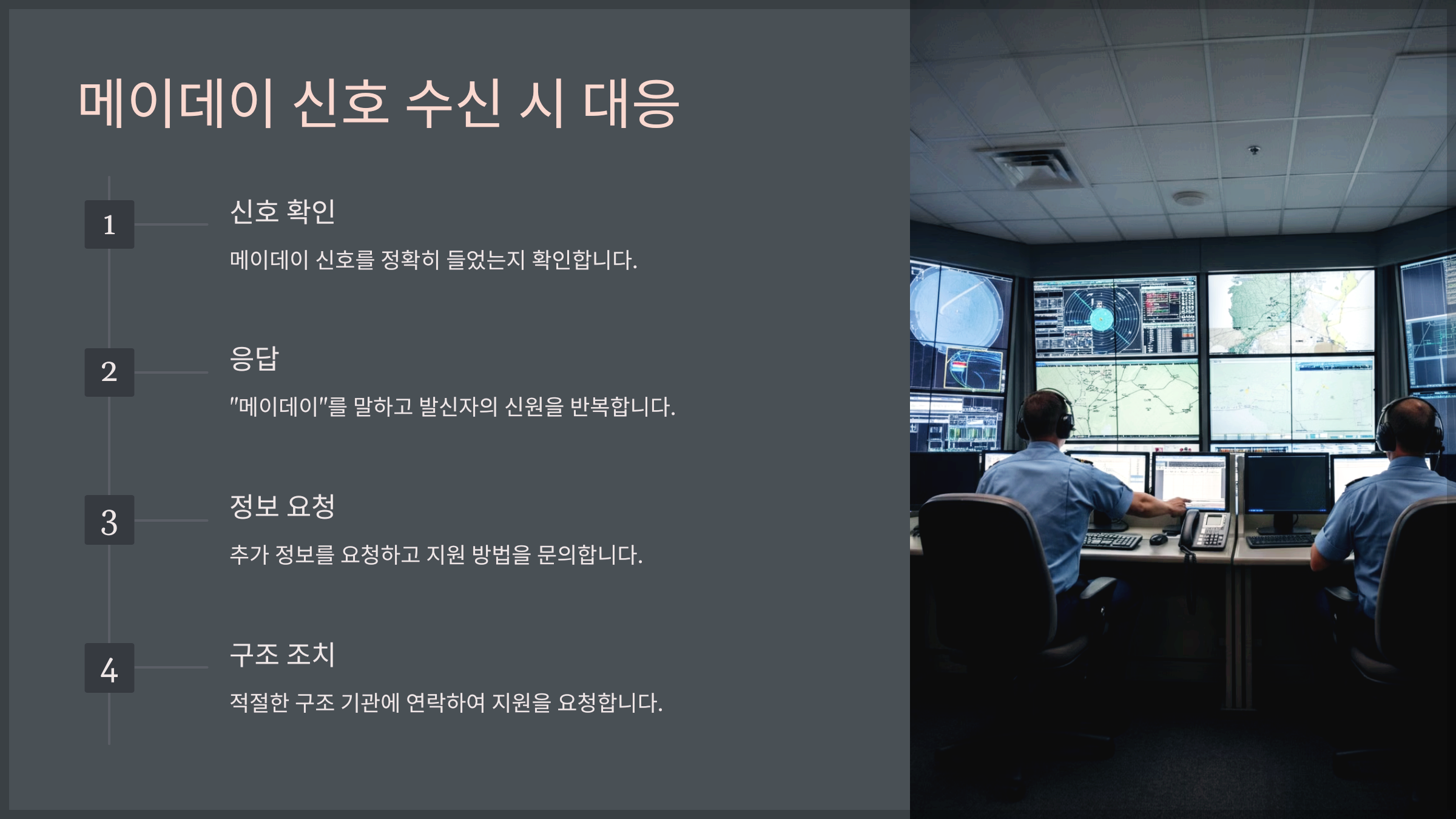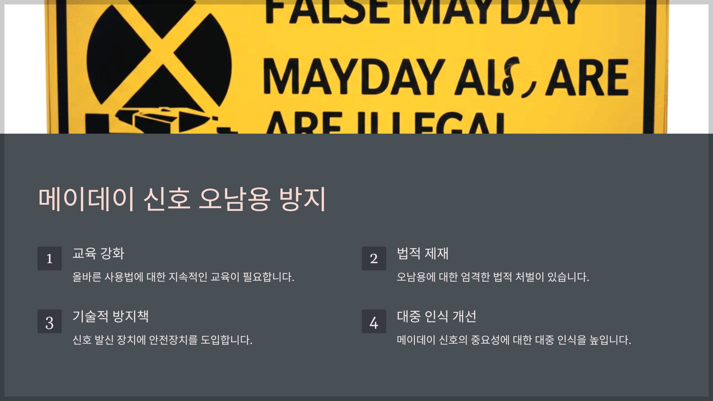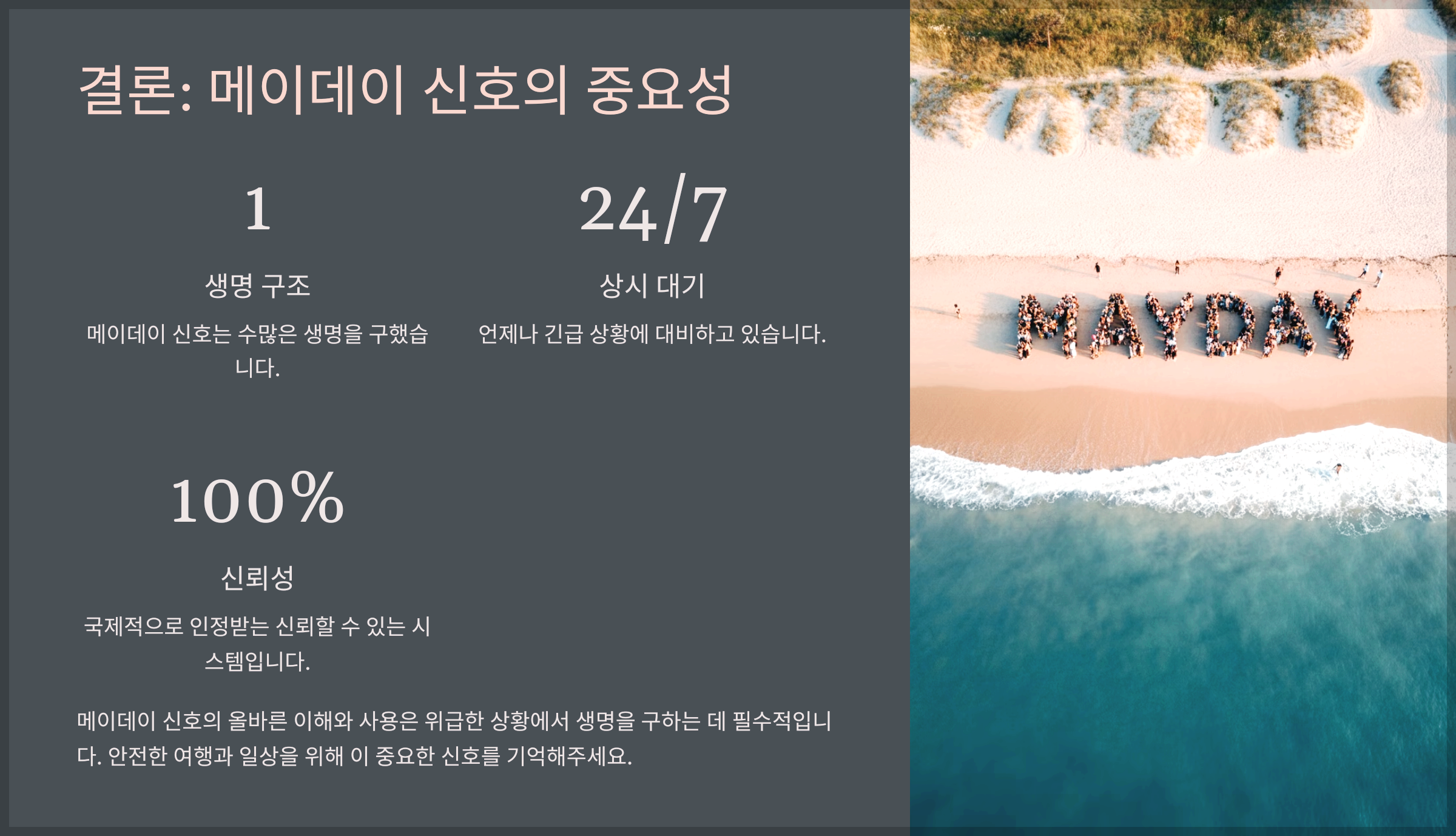 메이데이의 올바른 이해와 사용법을 아는 것은 긴급 상황에서 생명을 구하는 데 필수적입니다. 우리가 모두 이 중요한 신호를 언제 어디서 사용해야 하는지 정확히 알고 있어야 하며, 실제로 사용할 일이 없기를 바랍니다. 항상 안전한 여행과 일상을 유지하시기 바랍니다.