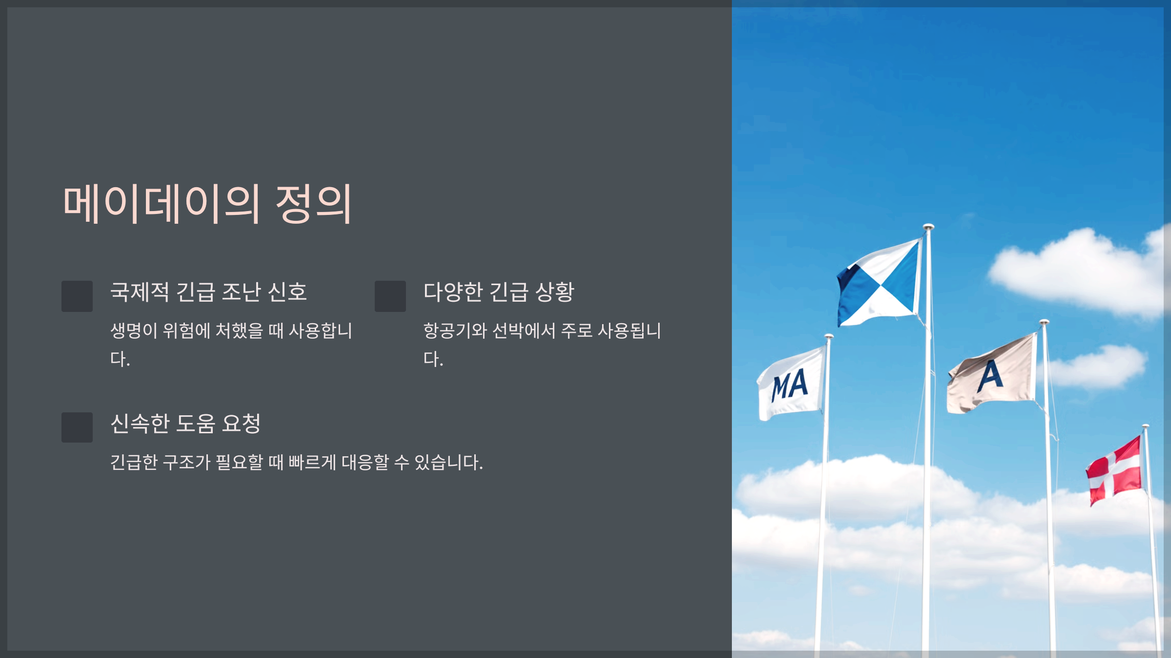 메이데이는 생명이 위험에 처했을 때 사용하는 국제적인 긴급 조난 신호로, 다양한 유형의 긴급 상황에서 활용될 수 있습니다. 특히 항공기와 선박에서 주로 사용되며, 긴급한 구조가 필요할 때 이 신호를 통해 신속하게 도움을 요청할 수 있습니다.