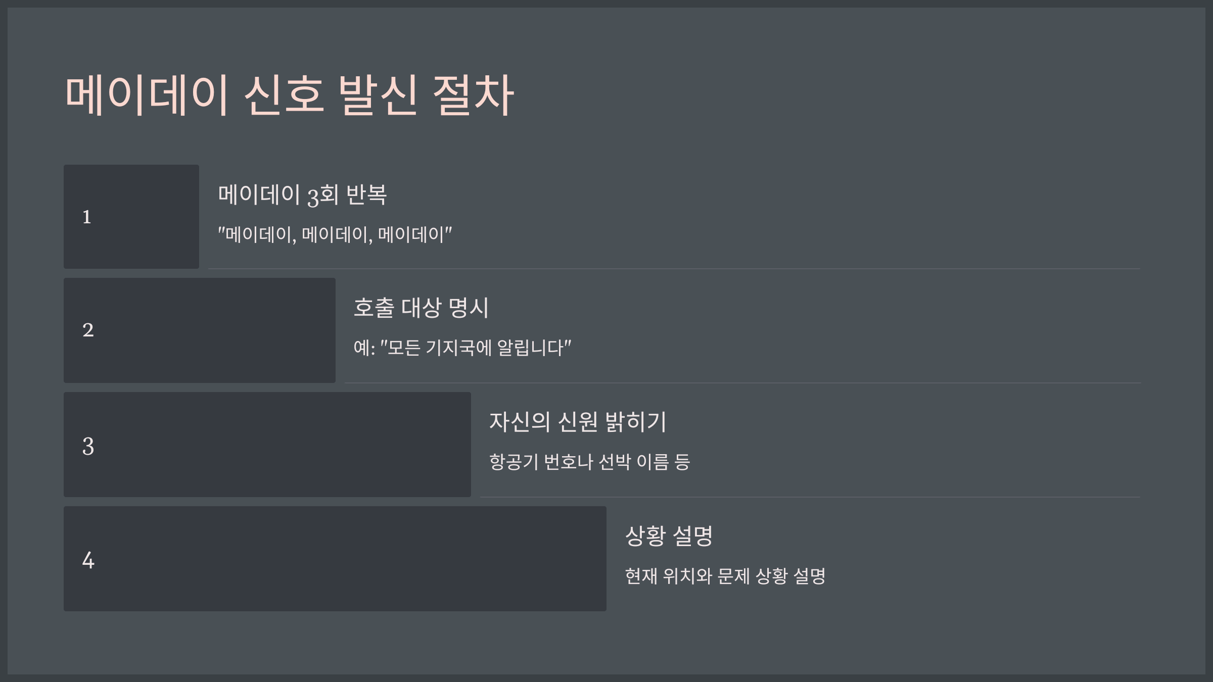메이데이 신호는 "메이데이, 메이데이, 메이데이"와 같이 세 번 반복해 발신해야 합니다. 이는 통신 중 잡음이나 오류로 메시지가 제대로 전달되지 않을 위험을 최소화하려는 조치입니다. 이를 통해 긴급 상황에 빠르고 명확한 응답을 기대할 수 있습니다.