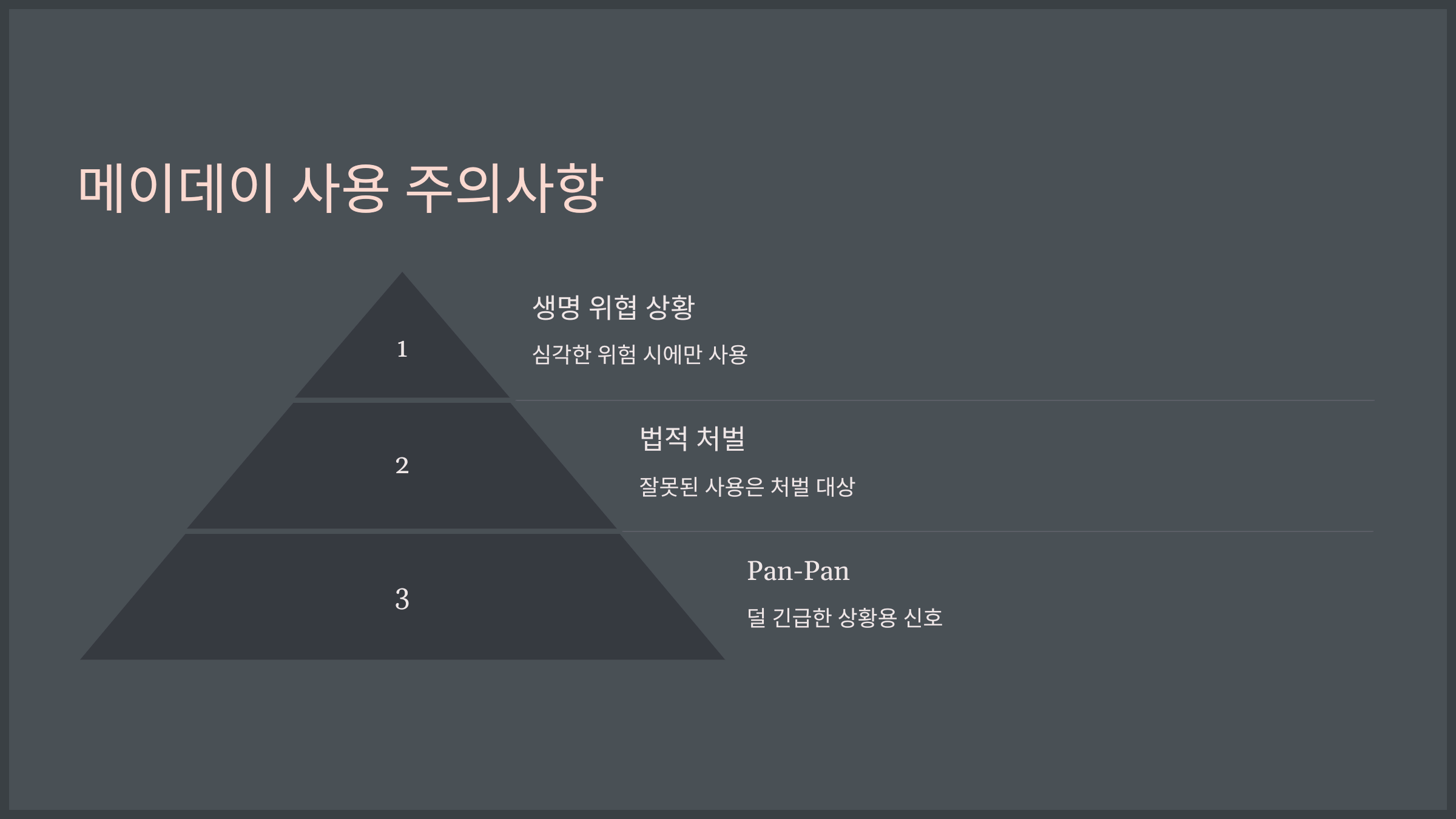 메이데이는 오직 생명이 위협받는 심각한 상황에서만 사용해야 합니다. 잘못된 사용은 법적 처벌을 받을 수 있으며, 덜 긴급한 상황에서는 'Pan-Pan'이라는 신호를 사용할 수 있습니다.