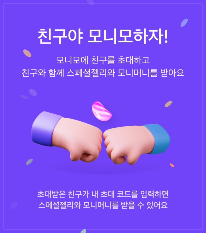 모니모 앱에는 초대 코드 시스템이 있다. 친구를 초대하면 서로 추가 젤리를 받을 수 있으니 이 기회를 활용해 보자. 코드 공유를 통해 더욱 빠르게 젤리를 모을 수 있지만, 과도한 공유는 삼가는 것이 좋다.