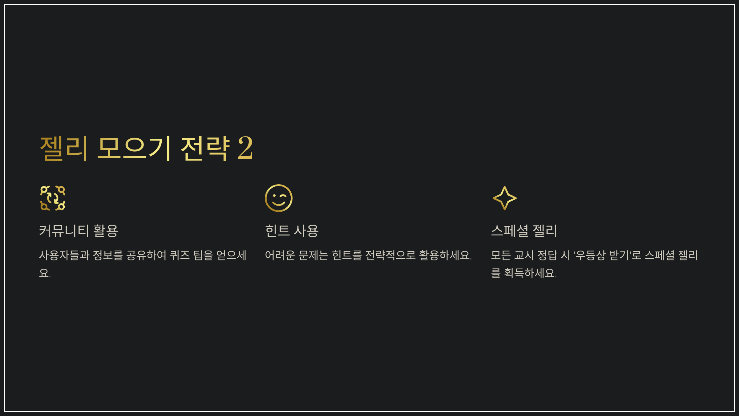 모든 교시의 문제를 맞히면 ‘우등상 받기’ 버튼이 활성화된다. 이를 클릭하면 스페셜 젤리를 받을 수 있다. 스페셜 젤리는 일반 젤리보다 높은 가치를 지니고 있어 현금화할 때 더욱 유리하다. 매일 꾸준히 참여해 스페셜 젤리의 혜택도 놓치지 말자.