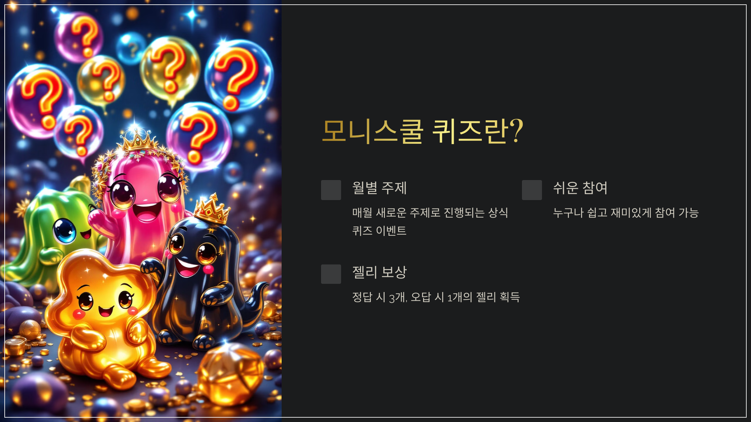 모니스쿨 퀴즈는 매월 새로운 주제로 진행되는 간단한 상식 퀴즈 이벤트다. 누구나 쉽고 재미있게 참여할 수 있으며, 퀴즈를 통해 젤리를 얻을 수 있다. 정답을 맞히면 일반 젤리 3개를 받을 수 있고, 틀려도 1개는 확보할 수 있으니 부담 없이 도전해 보자.