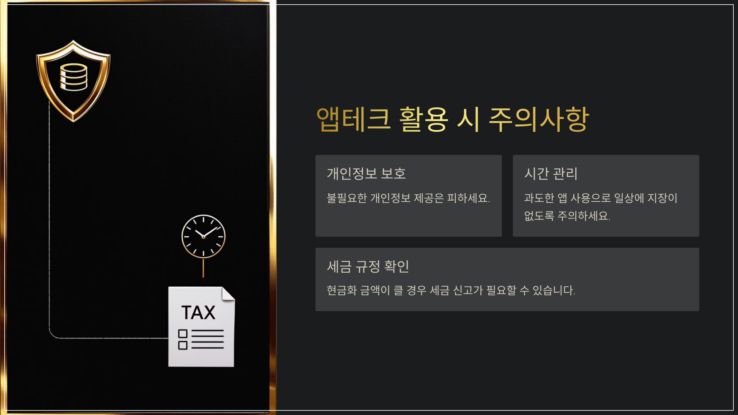 과도한 앱 사용으로 일상생활에 지장이 생기지 않도록 조절하자. - 현금화 관련 세금 규정 확인