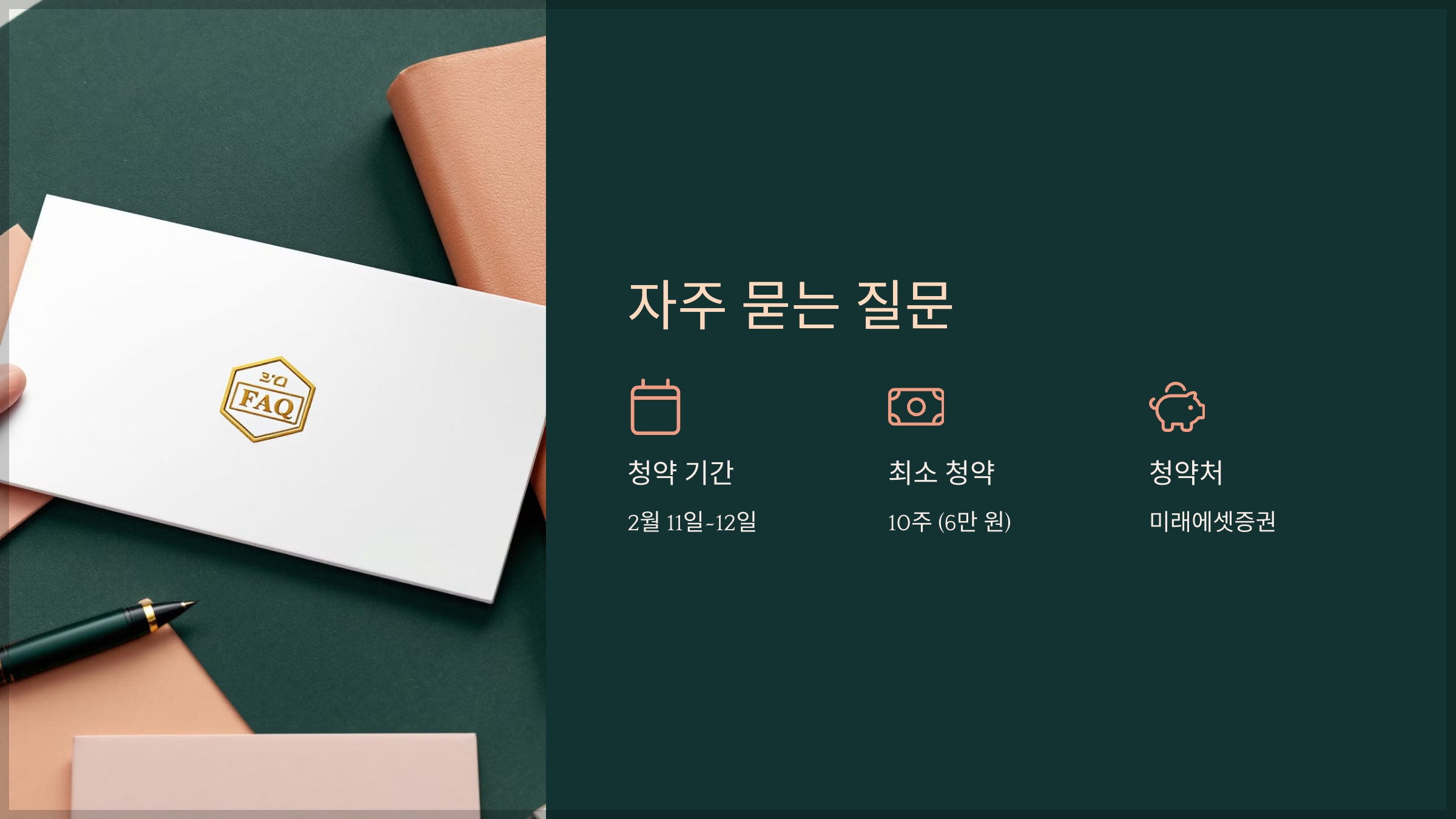 청약은 2월 11일부터 12일까지 진행되며, 배정 결과는 2월 14일 발표된다. 청약을 원한다면 해당 기간 내에 참여해야 하며, 대표 주관사인 미래에셋증권을 통해 신청할 수 있다.