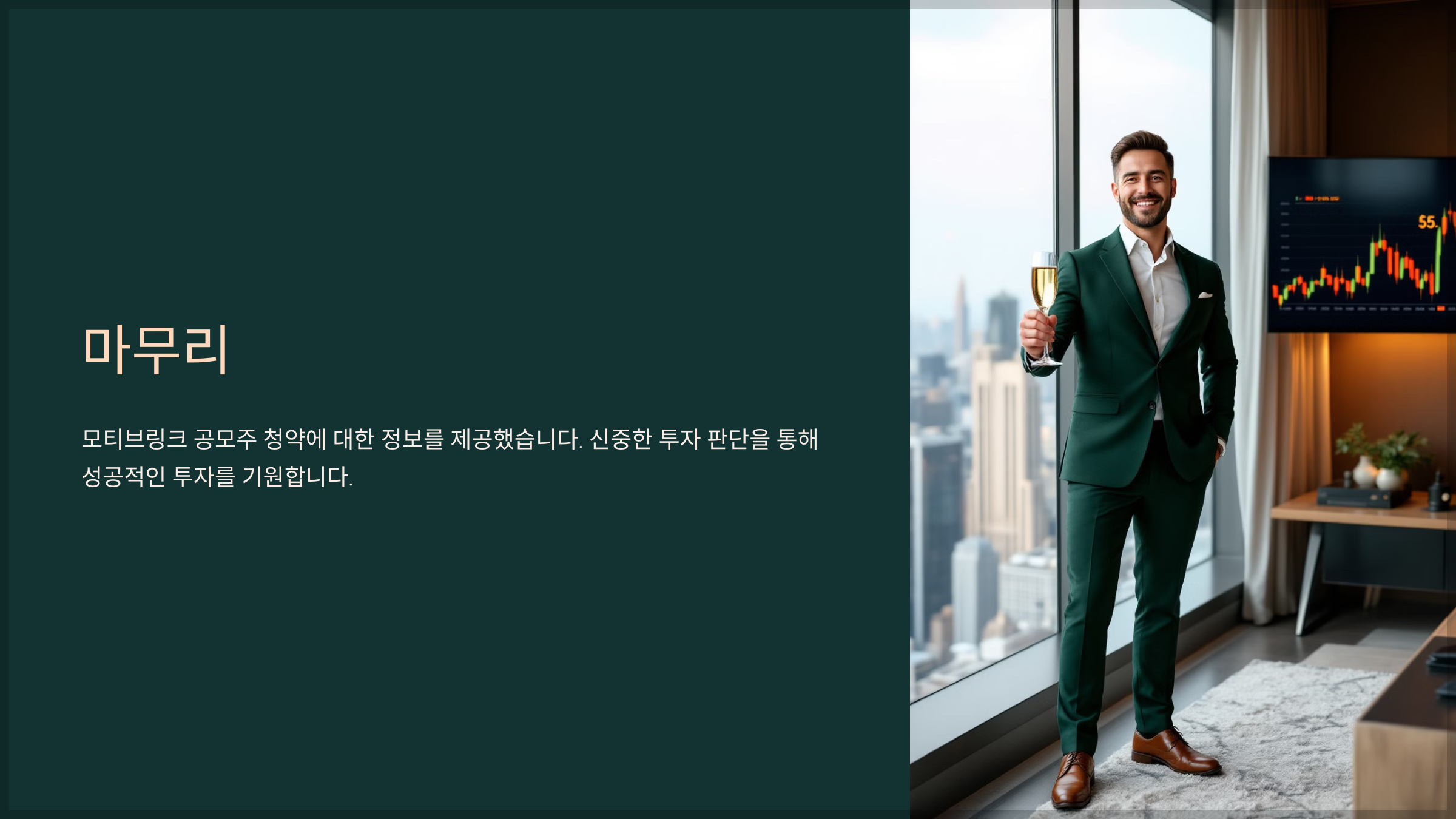 모티브링크는 기관투자자들의 긍정적인 반응 속에서 공모가를 확정하며 본격적인 청약 일정에 돌입했다. 높은 기관 경쟁률과 코스닥 상장 기대감이 긍정적인 요소로 작용하지만, 상장 후 주가 변동성에 대한 리스크 관리도 필요하다.