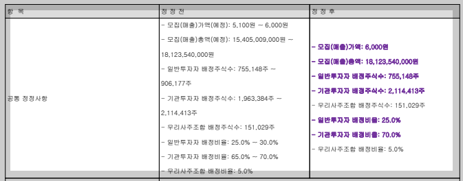 | 배정 비율 | 기관투자자 70%, 일반투자자 25%, 우리사주조합 5% |