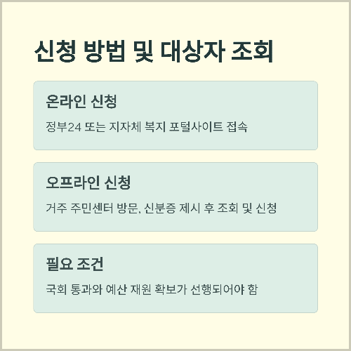정책이 시행된다면 온라인 신청 시스템이 주로 활용될 가능성이 높고, 일부 대상자는 자동지급도 고려되고 있습니다.