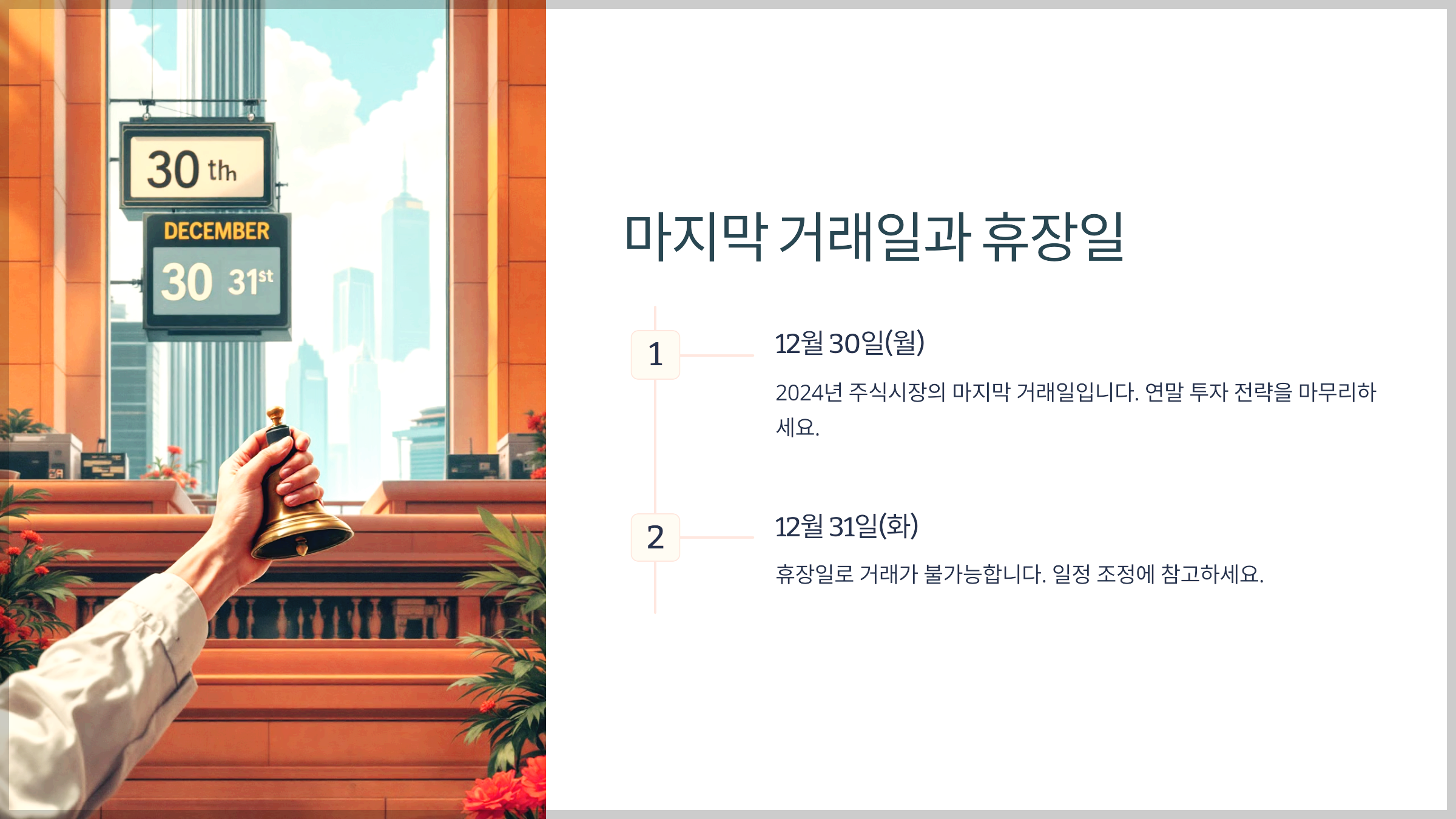 2024년 주식시장의 마지막 거래일은 12월 30일(월)입니다. 이날까지 연말 투자 전략을 마무리해야 합니다. 다음 날인 12월 31일(화은 휴장 일로 거래가 불가능하니 일정 조정에 참고하세요.