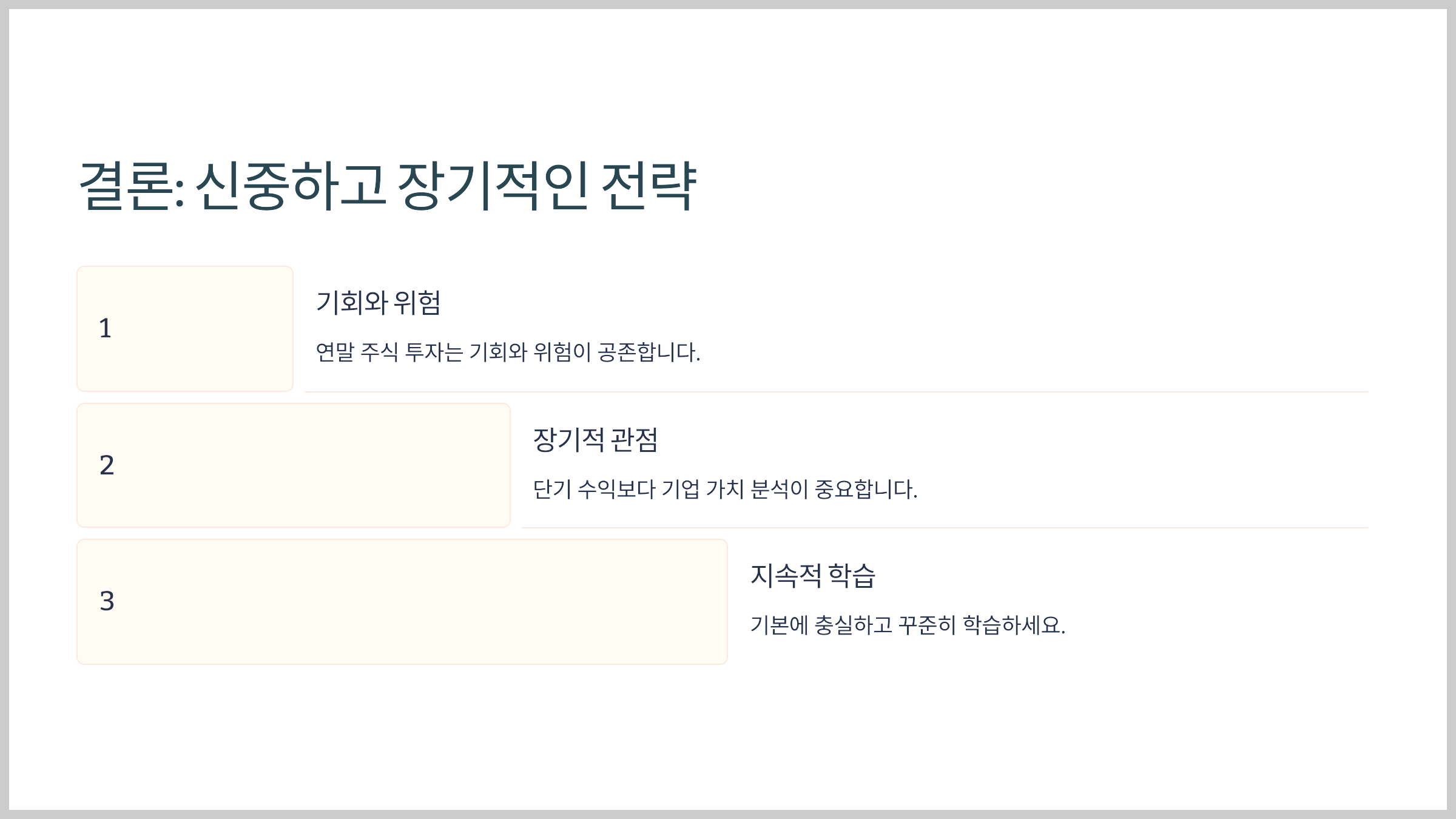 투자 전에는 기업 공시와 경제 뉴스를 꼼꼼히 확인하는 것이 중요합니다. 기본에 충실하고 꾸준히 학습한다면 연말 투자에서도 좋은 성과를 낼 수 있습니다. 여러분의 투자가 성공적이길 진심으로 응원합니다!