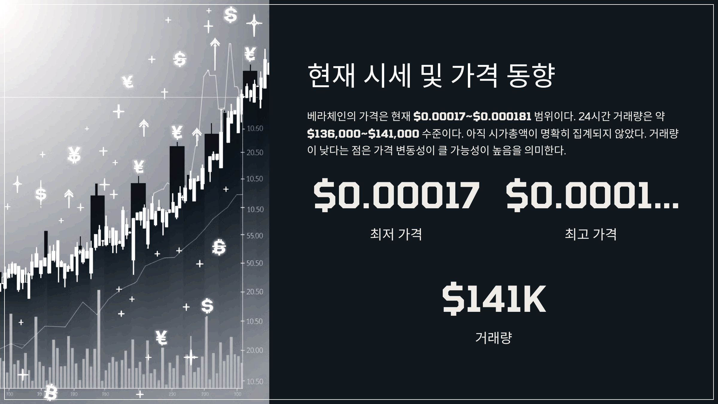 베라체인의 가격은 현재 $0.00017~$0.000181 범위에서 형성되고 있으며, 24시간 거래량은 약 $136,000~$141,000 수준이다. 아직 시가총액이 명확히 집계되지 않은 점을 고려할 때, 프로젝트는 초기 단계에 속한다고 볼 수 있다.