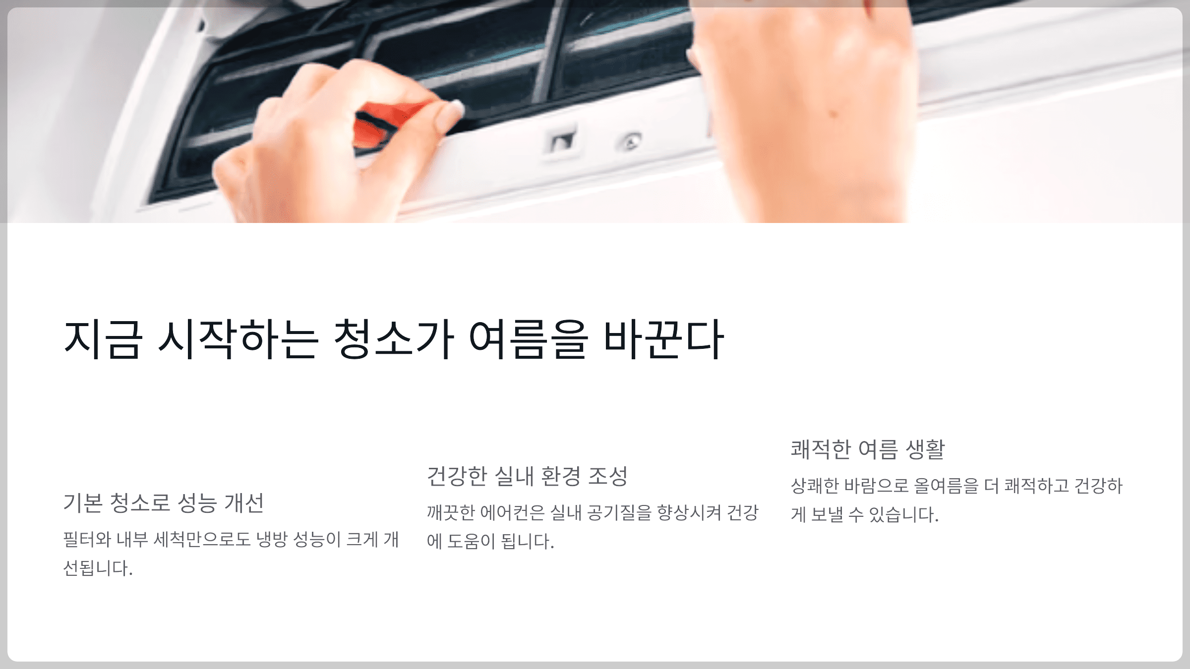 깨끗한 에어컨에서 나오는 바람은 상쾌함이 달라요. 올여름은 쾌적하고 건강하게 보낼 수 있을 거예요.