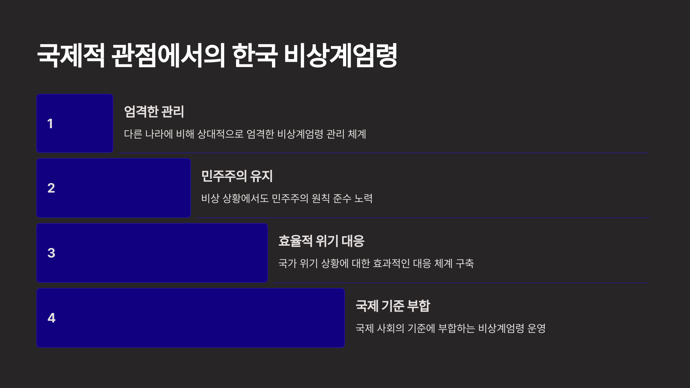 국제 콘퍼런스에서 여러 국가의 비상 상황 대응 체계를 연구했는데, 한국의 비상계엄령 시스템이 다른 나라에 비해 상대적으로 엄격하게 관리되고 있음을 알게 되었습니다. 이는 민주주의를 유지하면서도 국가 위기 대응의 효율성을 높이기 위한 중요한 균형점입니다.
