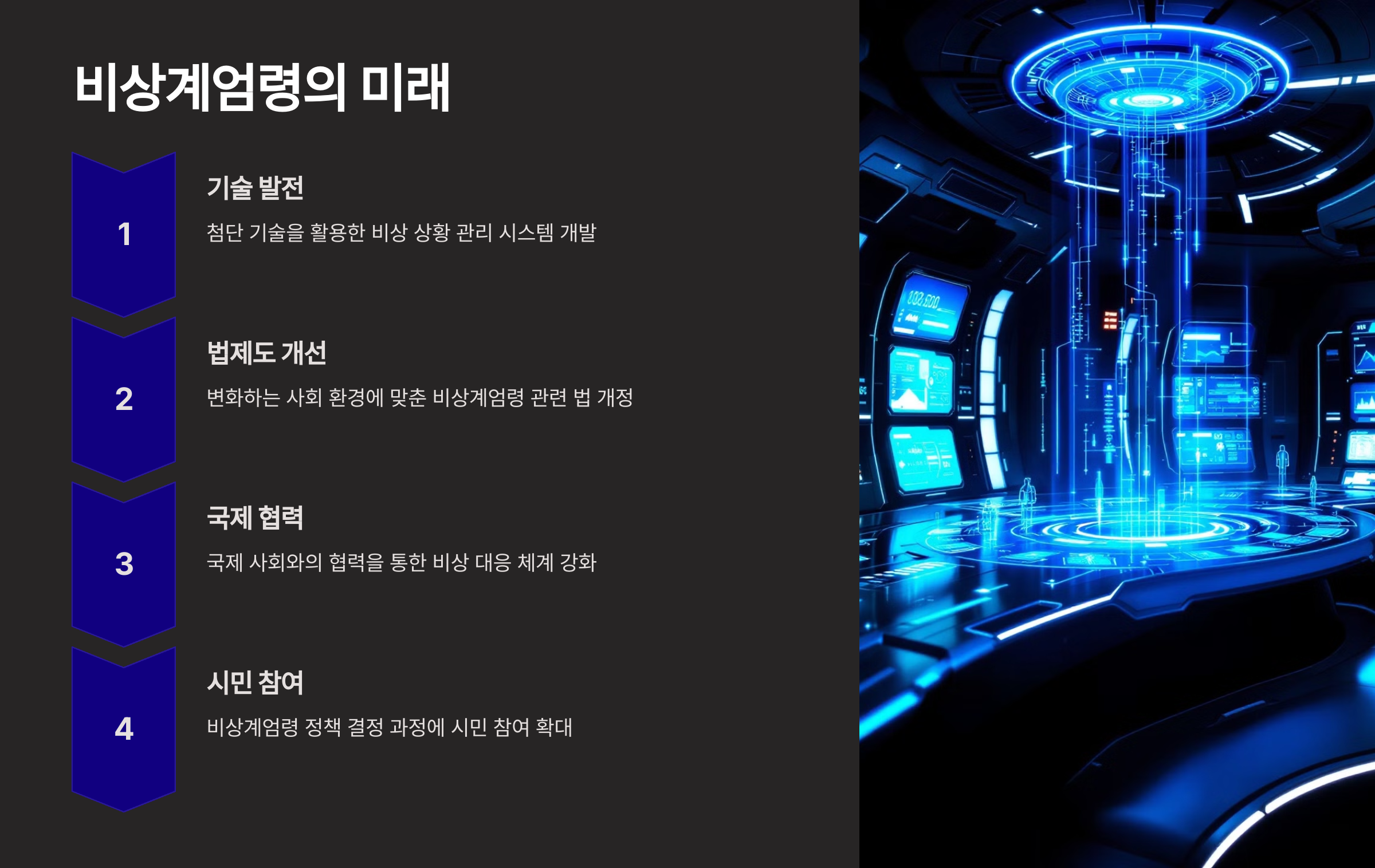 현대 사회에서 비상계엄령의 필요성과 그 적용 여부에 대한 논의는 계속되고 있습니다. 정보 기술의 발전과 국제 사회의 복잡성 등을 고려할 때, 비상계엄령의 선포는 과거보다 훨씬 더 신중하게 접근해야 합니다. 이를 무시하고 했을 경우, 국제 거래(외환 유출, 환율 거래) 및 국내 경제에 심각한 타격을 받을 수 있기에 그렇습니다.