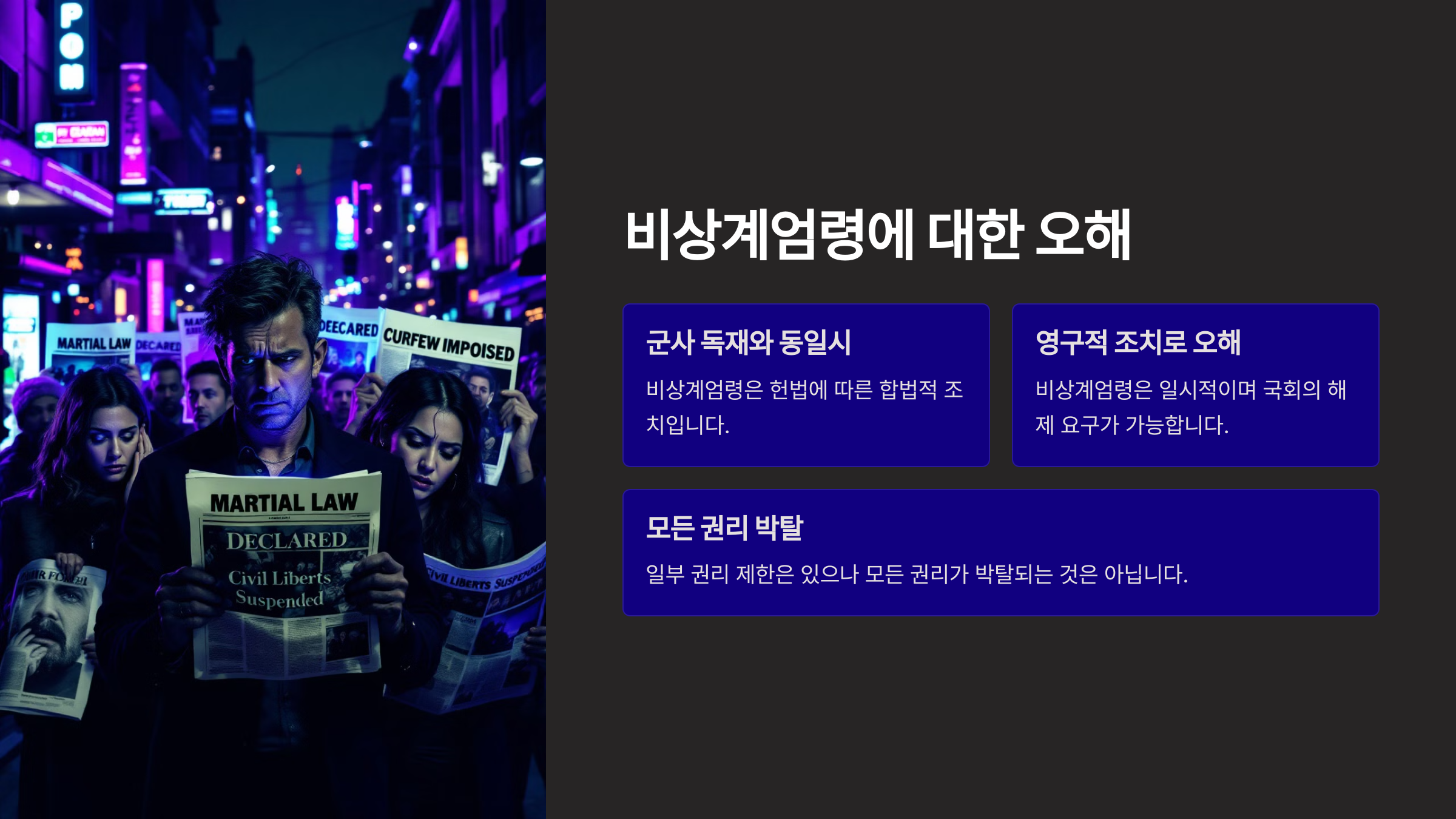 많은 사람이 비상계엄령을 군사 독재와 동일시하는 경향이 있지만, 이는 정확한 이해가 아닙니다. 비상계엄령은 헌법에 따라 합법적으로 발동되는 조치로, 국가 위기 상황에서 신속하고 효율적인 대응을 목표로 합니다. 물론 잘못 사용되면 문제를 일으킬 수 있지만, 그 본래의 목적은 국가와 국민을 보호하기 위한 것입니다.