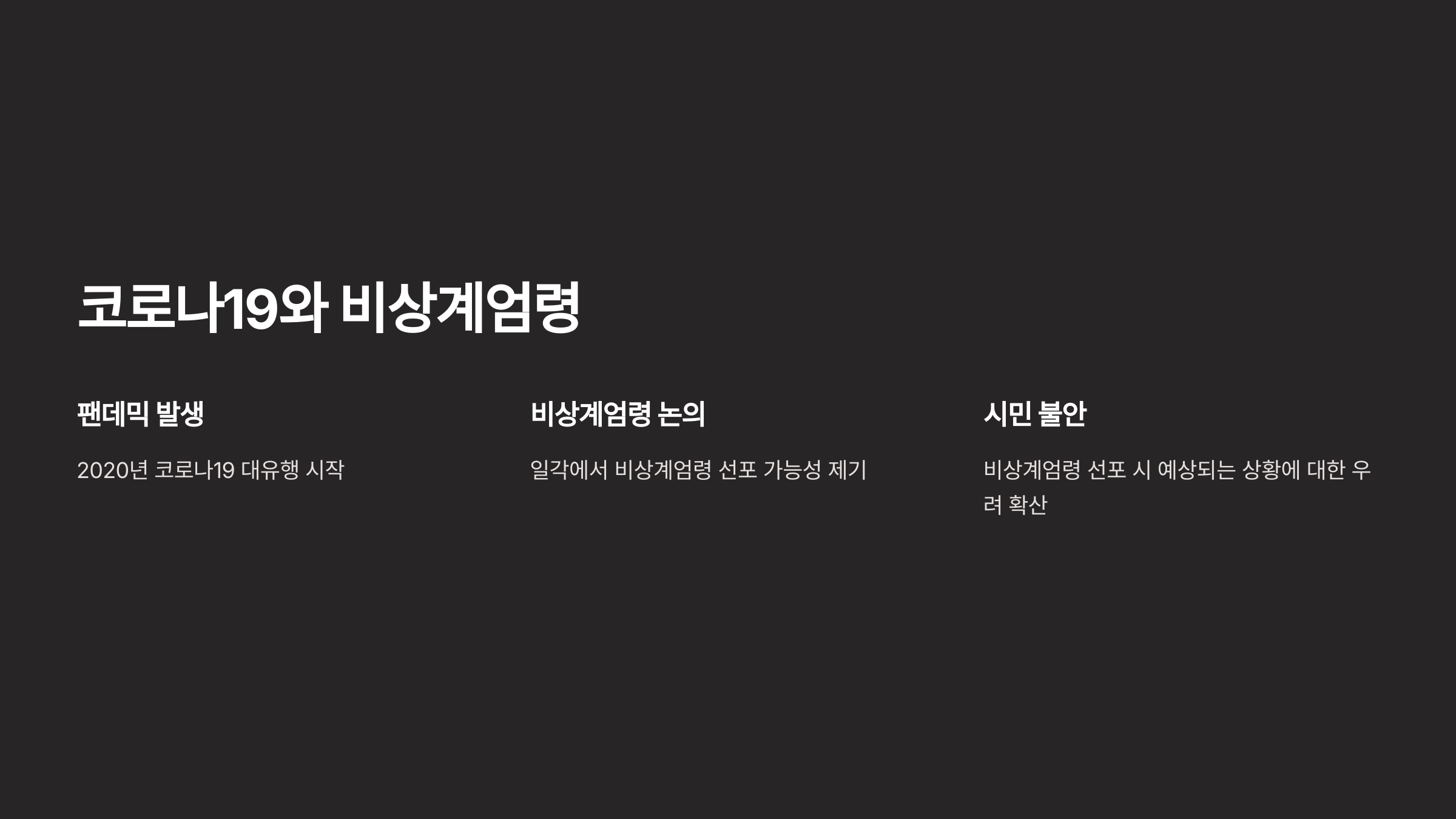 2020년 코로나 19 팬데믹이 발생했을 때, 일각에서는 비상계엄령 선포 가능성이 제기되었습니다. 당시 저는 비상계엄령에 대한 시민들의 불안을 해소하기 위해 여러 매체와 인터뷰를 진행했었는데, 많은 분이 실제로 선포되었을 때 일어날 상황에 대해 크게 우려하고 계셨습니다. 이러한 사례는 비상계엄령이 미칠 수 있는 일상의 변화를 잘 보여줍니다.