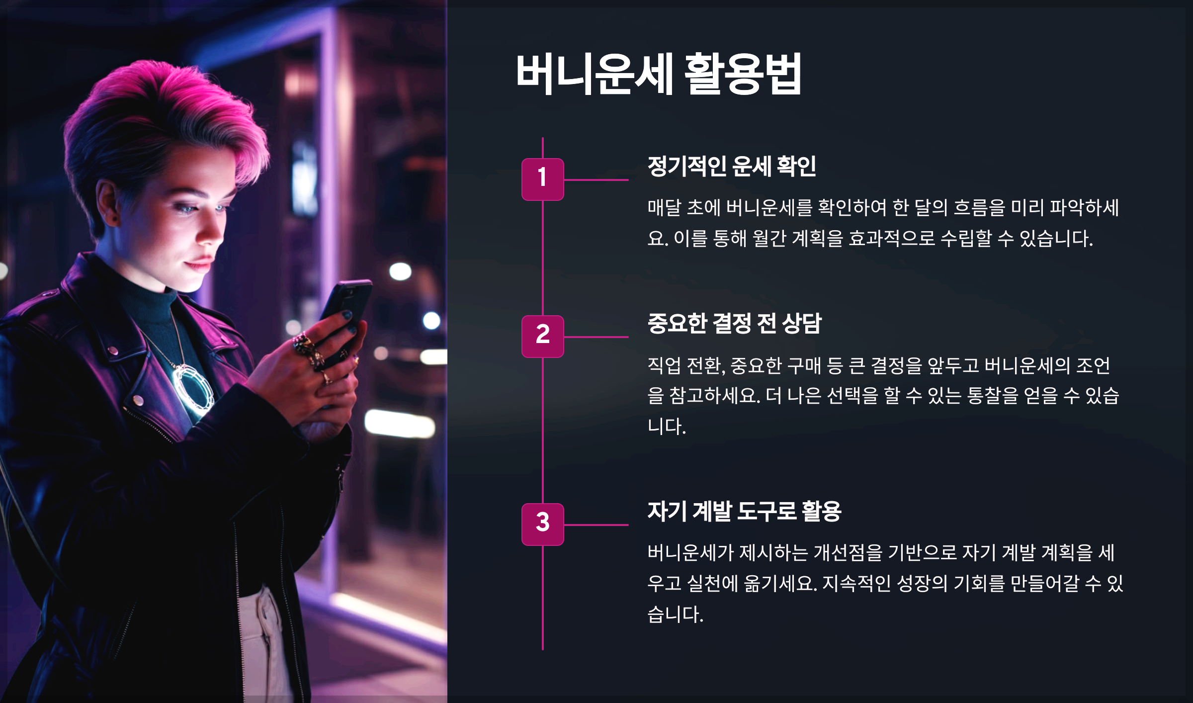 정기적인 운세 확인 : 매달 초에 버니운세를 확인하여 한 달의 흐름을 미리 파악하세요.
