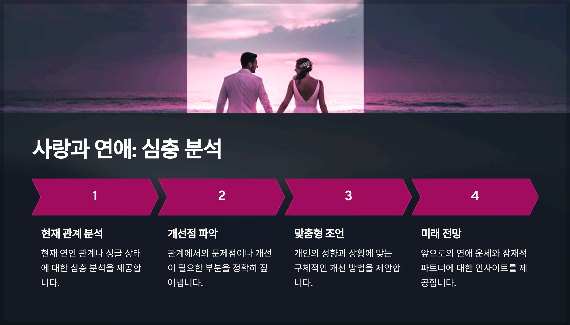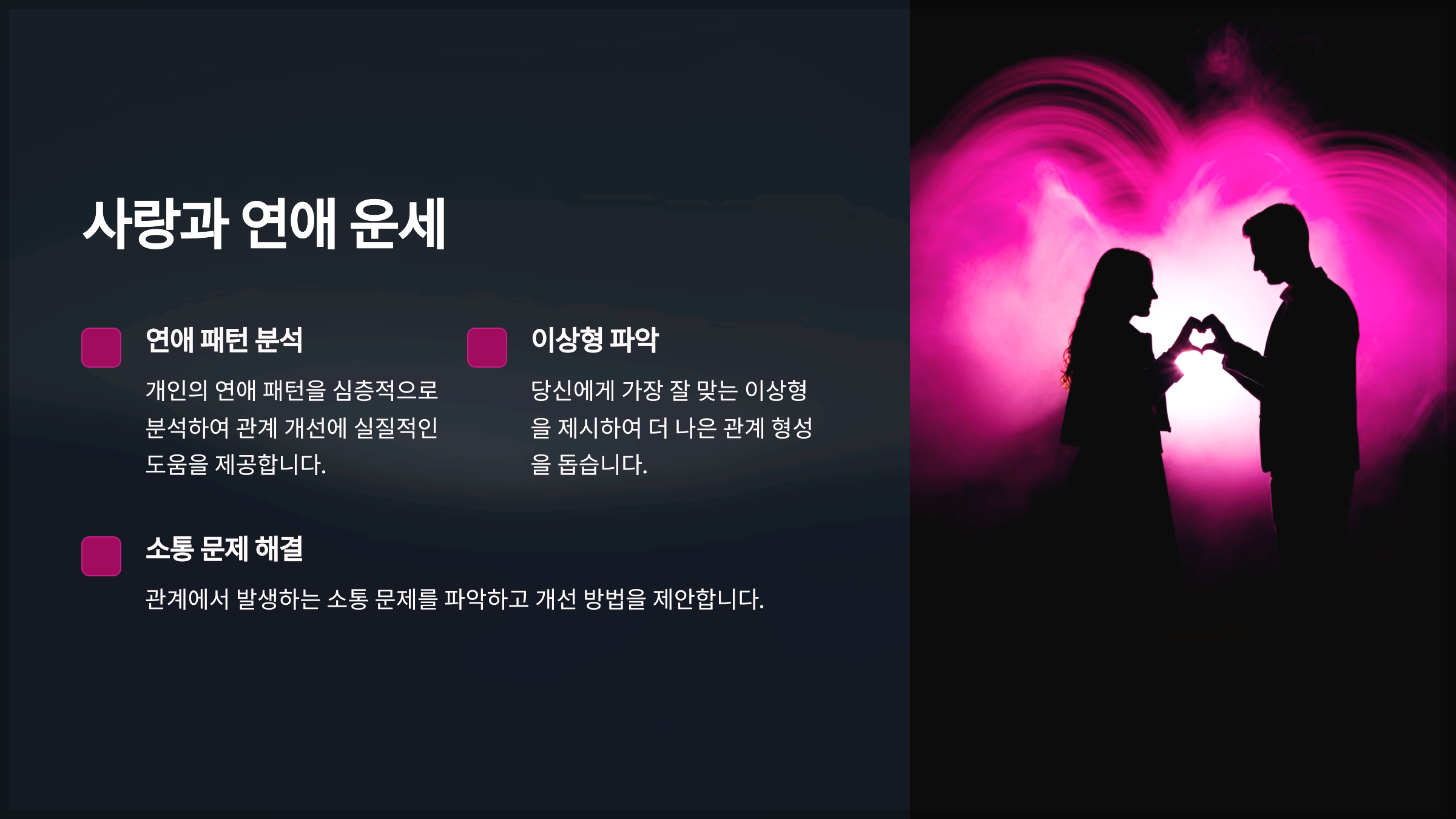 - A: 심리학적 분석과 전문가의 경험을 결합해 높은 신뢰도를 자랑합니다. 다만, 운세는 참고사항일 뿐 최종 결정은 본인의 몫입니다.