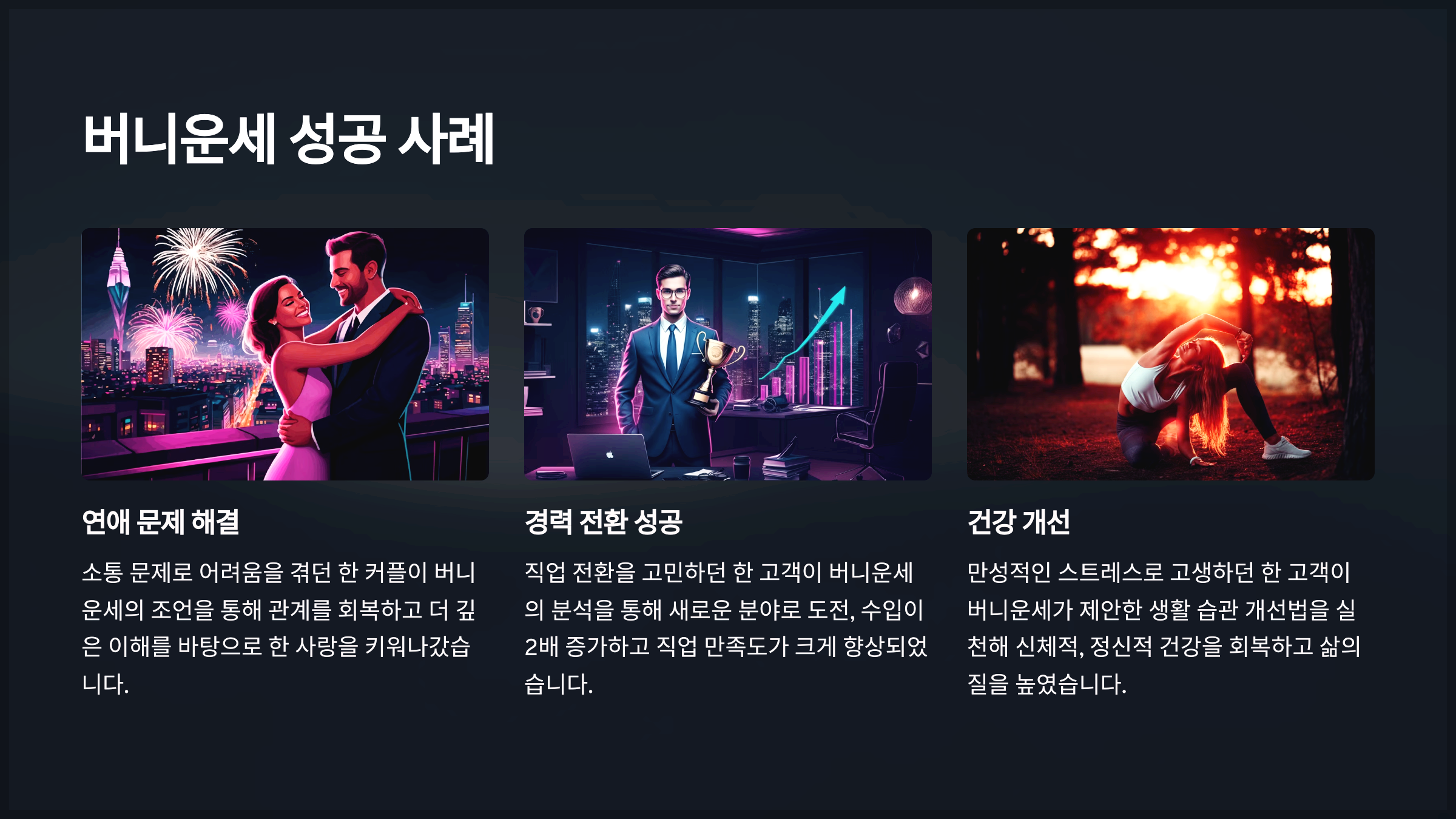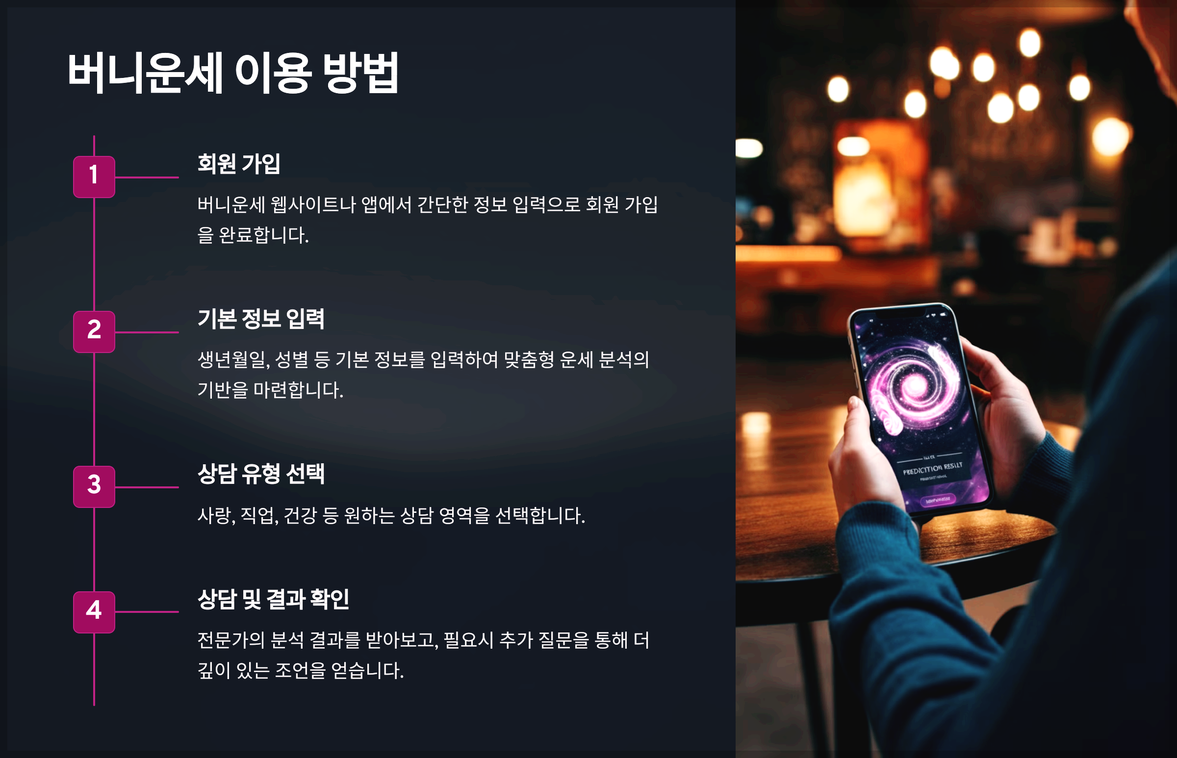 버니운세는 단순히 운명을 예측하는 데 그치지 않고, 개인의 일상적인 고민과 현재 상황을 반영하여 실질적으로 적용 가능한 조언을 제공합니다. 이는 단순한 점괘 이상의 가치를 지니며, 삶의 방향성을 찾는 데 큰 도움이 됩니다.