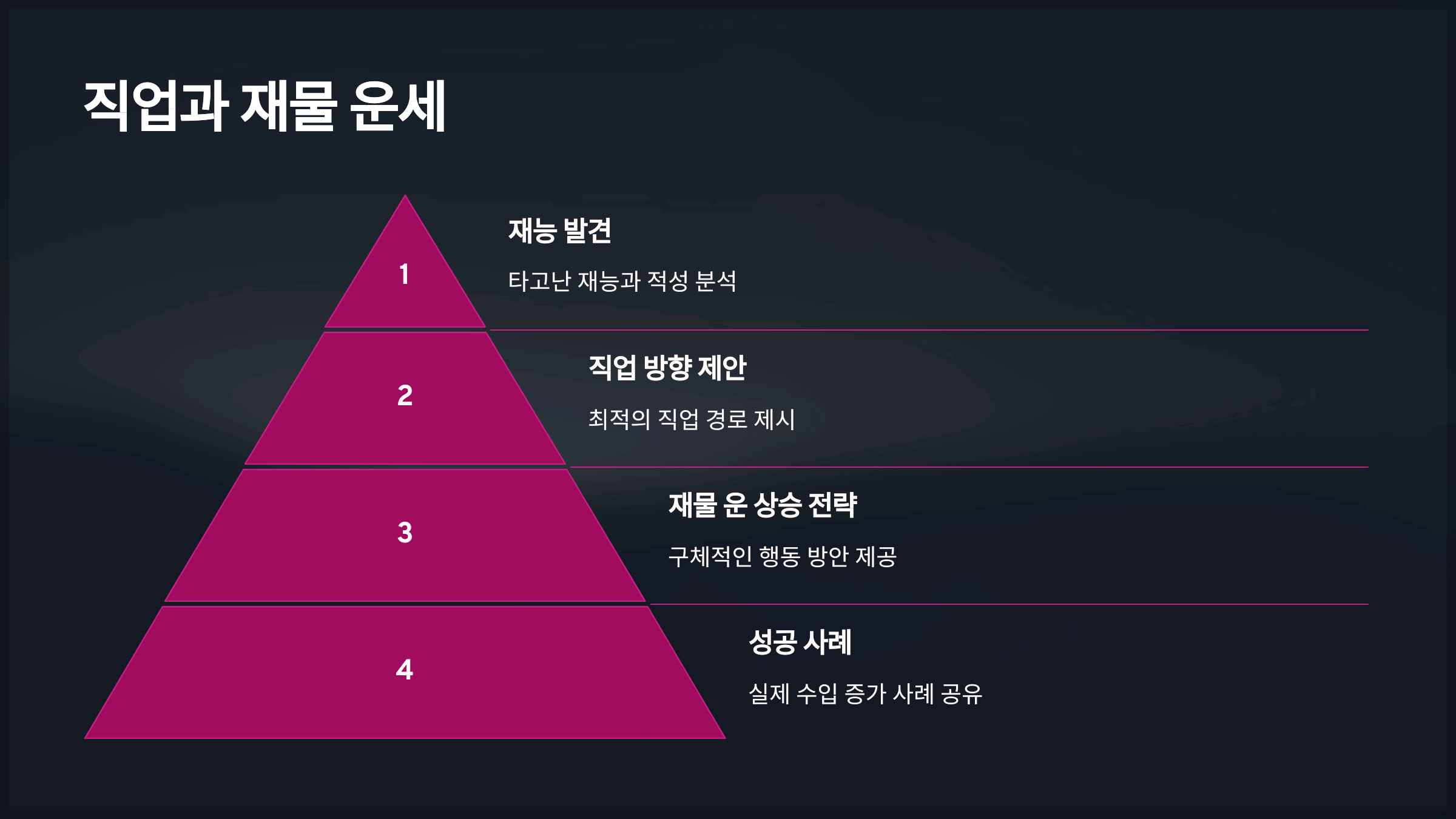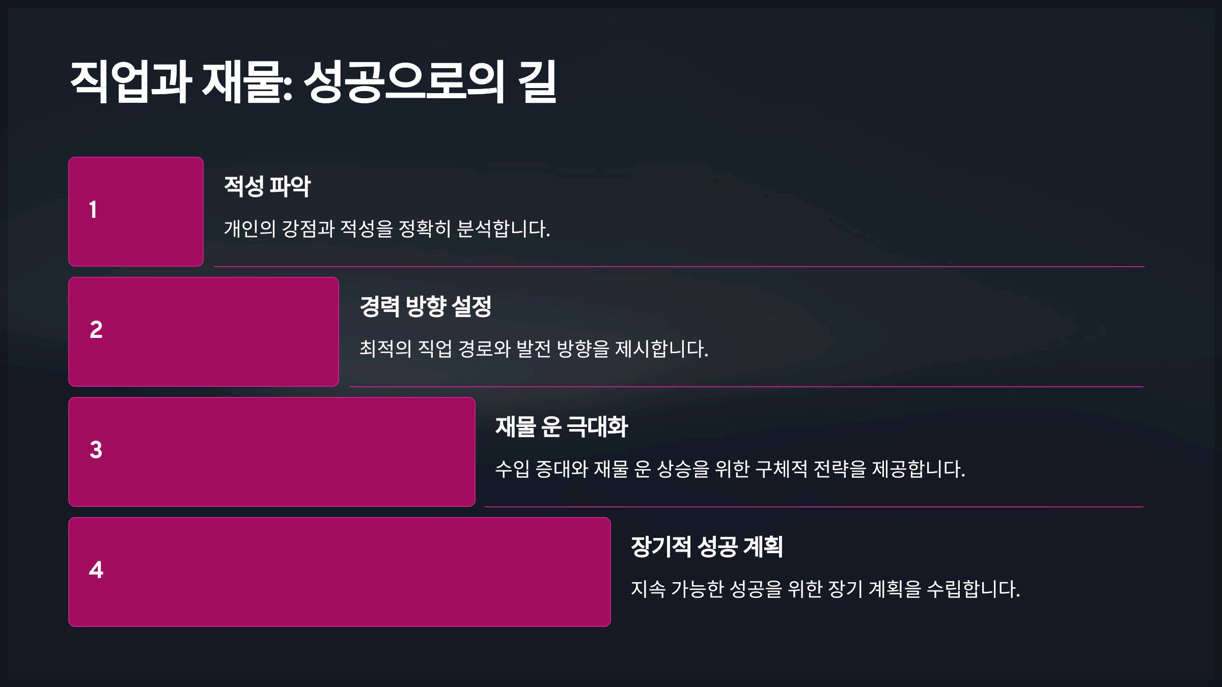 타고난 재능과 적성을 분석해 최적의 직업 방향을 제안합니다. 또한, 재물 운을 상승시키기 위한 구체적인 행동 방안을 제시하며, 실제로 조언을 따라 직업을 전환해 수입이 2배 증가한 사례도 있습니다.