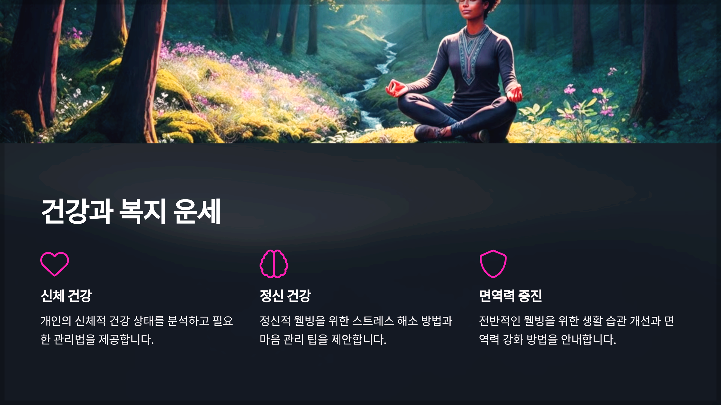 신체적, 정신적 건강 상태를 종합적으로 분석해 필요한 관리법을 제공합니다. 스트레스 해소부터 면역력 증진을 위한 생활 습관까지, 전반적인 웰빙을 위한 구체적인 가이드를 제안합니다.