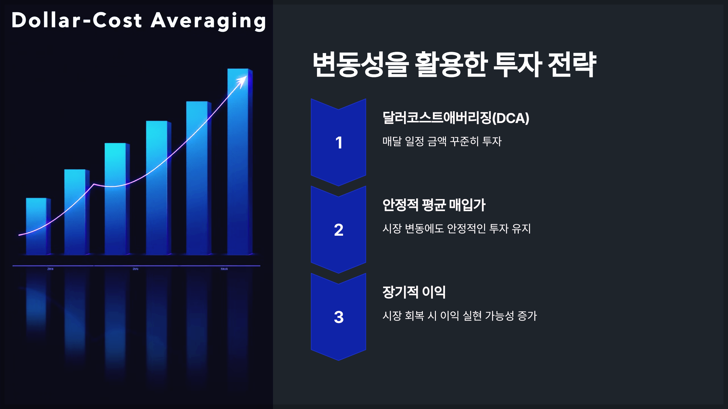 비트코인의 가격 변동성은 위험 요소이자 동시에 기회가 될 수 있습니다. 단기적인 급등락이 크기 때문에, 현명한 전략이 필요합니다. 제가 추천하는 방법은 달러코스트애버리징(DCA) 전략입니다. DCA는 매달 일정 금액을 꾸준히 투자하는 방식으로, 이를 통해 시장의 급격한 변동에도 안정적인 평균 매입가를 유지할 수 있습니다. 실제로 저는 이 전략을 통해 큰 하락기에도 손실을 줄일 수 있었고, 시장이 회복될 때에는 이익을 얻을 수 있었습니다. 예를 들어, 2022년 초 큰 하락이 있었을 때도 저는 DCA 전략으로 꾸준히 매수했습니다. 이로 인해 2023년 후반 시장이 회복되었을 때 기대 이상의 수익을 올릴 수 있었습니다.